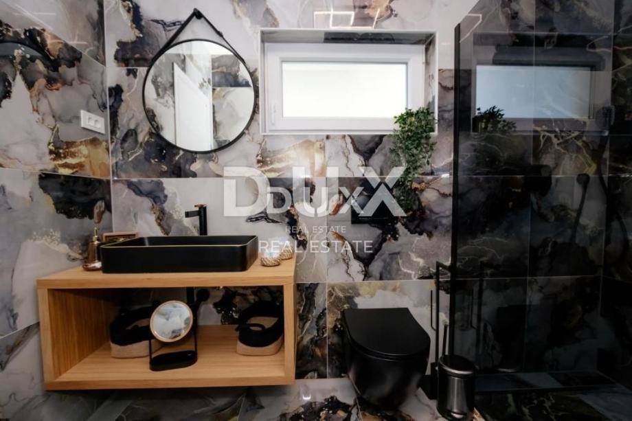 Okućnica od 500 m² u potpunosti je ograđena i osigurava maksimalnu privatnost. Uređeni vrt s automatskim navodnjavanjem, bazen od 32 m² sa sunčalištem te natkrivena terasa čine vanjski prostor jednako impresivnim kao i interijer.