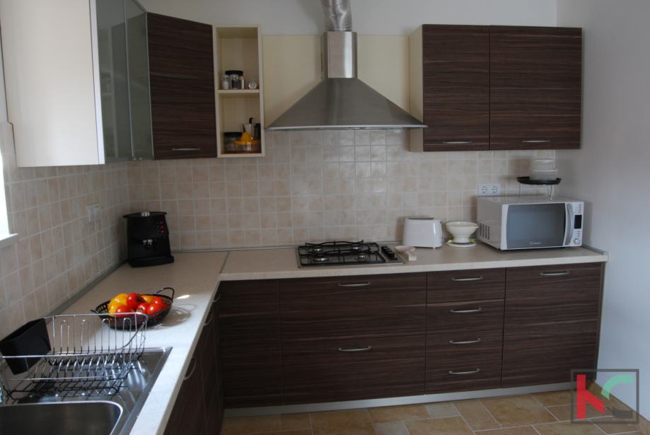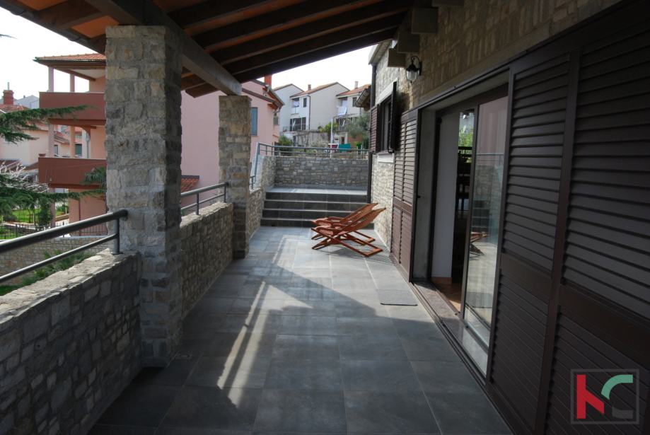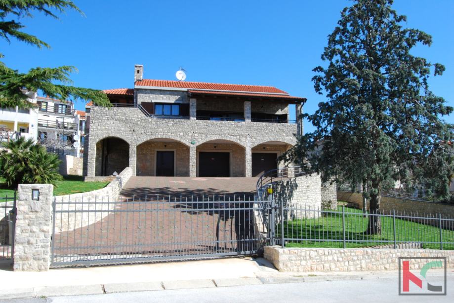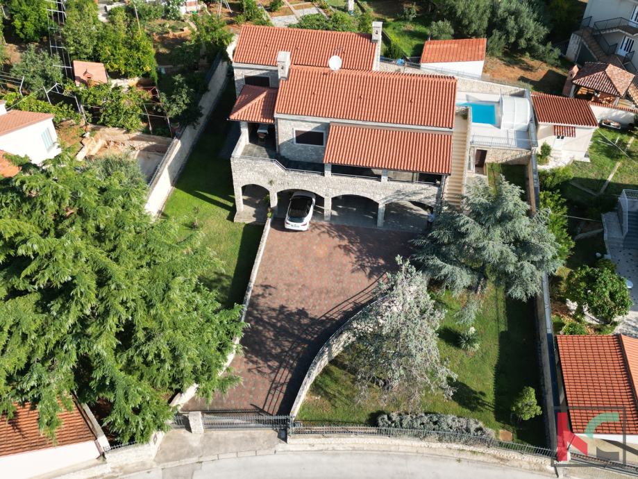 Prizemlje kuće nudi praktičnost s dvije garaže, jedna od njih povezana s elegantnim stanom. Stan na prizemlju nudi udobnost s dvije spavaće sobe, prostranim dnevnim boravkom, modernom kuhinjom, kupaonicom i zasebnim WC-om. Prostrana terasa, savršena za druženje, povezana je s prekrasnim dvorištem i bazenom. Bazen, opremljen kliznom kupolom za uživanje tijekom cijele godine, dodaje dodatnu razinu luksuza.