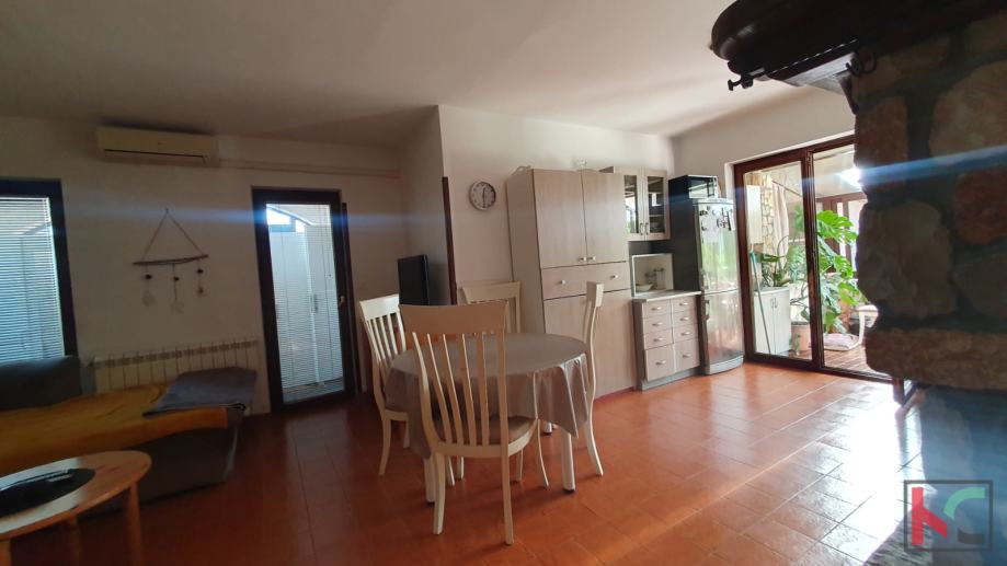 Sa dvije male stepenice ulazimo u "open space" prostor dnevnog boravka i kuhinje te prostrane sunčane lođe koja ima i izlaz na vrt.