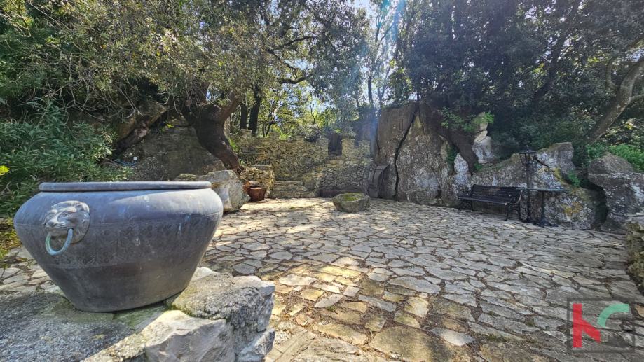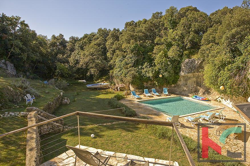 Prostire se na nekoliko odvojenih parcela s visinskim razlikama što osigurava razigranost i različitu funkcionalnost korištenja nekretnine. Na jednom je dijelu bazen ukopan u stari kamenolom, na drugom dijelu igralište za badgminton, na povišenom dijelu među stablima u dubokom hladu, dio za odmor sa ležaljkama te odvojena parcela spremna za gradnju još jednog objekta odvojen od pogleda u dubokom hladu.
