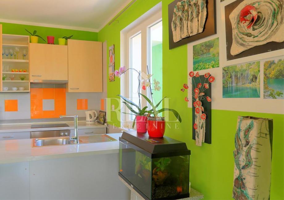 Stan u prizemlju ima open space dnevni boravak sa kuhinjom i blagovaonom, izlazom na terasu orijentiranu na zelenilo,dvije spavaće sobe i kupaonicu.
