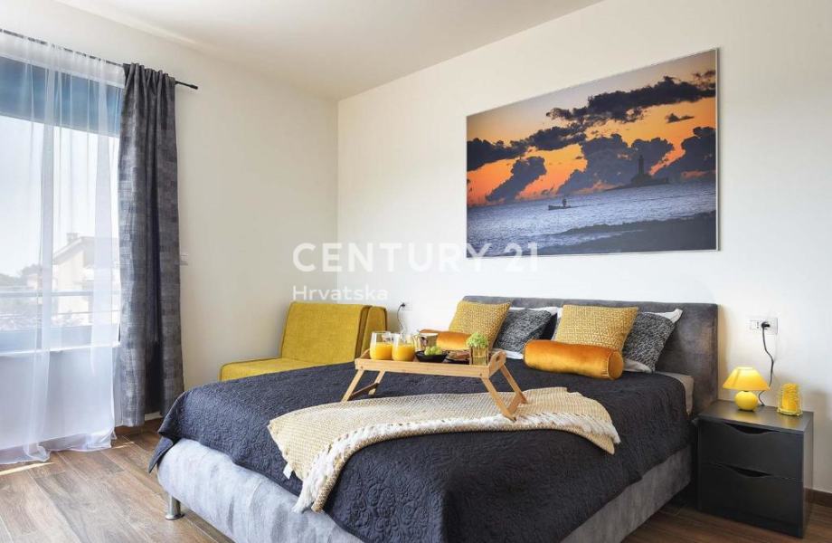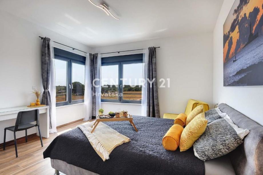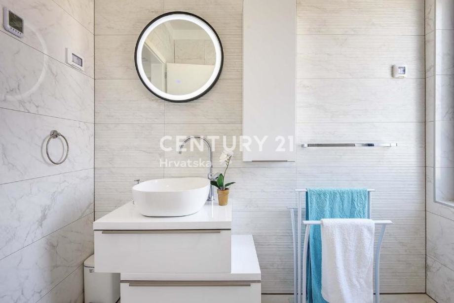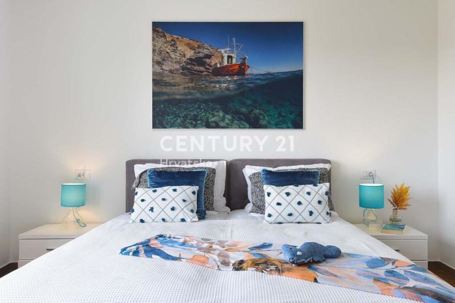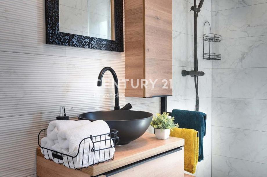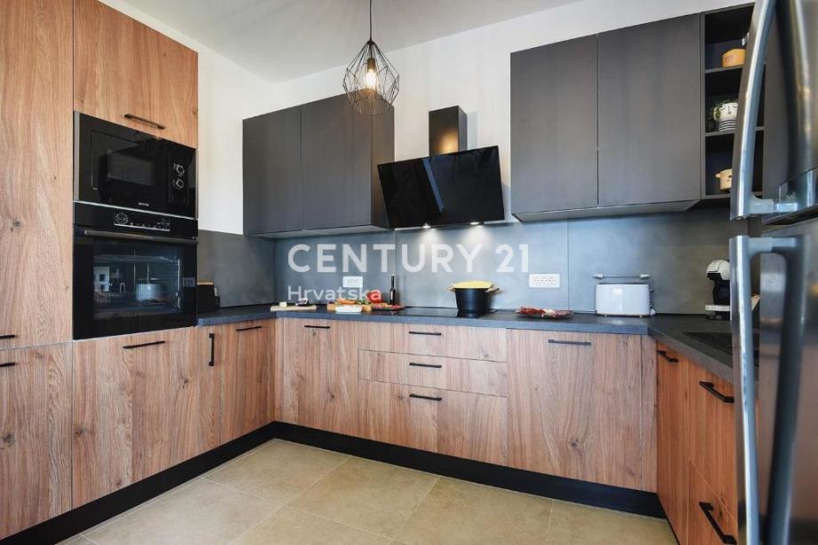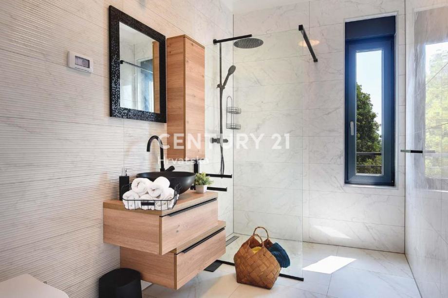 Na katu su smještene tri udobne spavaće sobe, svaka sa svojom kupaonicom, što naglašava luksuz, ali i praktičnost života u kući. Posebna vrijednost ove nekretnine leži u vrhunskoj opremi i tehnologiji: podno grijanje na toplinsku pumpu, klima uređaji s inverterom u svakoj prostoriji, te pomno odabran, moderan i luksuzan namještaj. Sve je potpuno novo, usklađeno i spremno za useljenje – bez ikakvih dodatnih ulaganja.