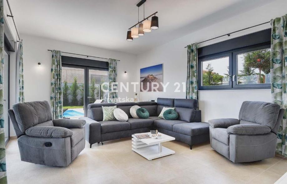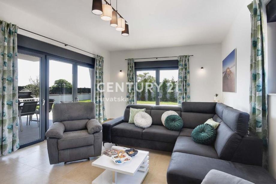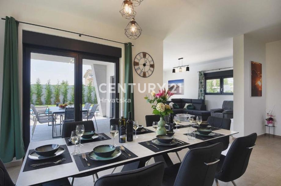 Na prodaju je moderna nova kuća površine 180 m2 neto, smještena u mirnom naselju nadomak Pule na zemljištu površine 550 m2.