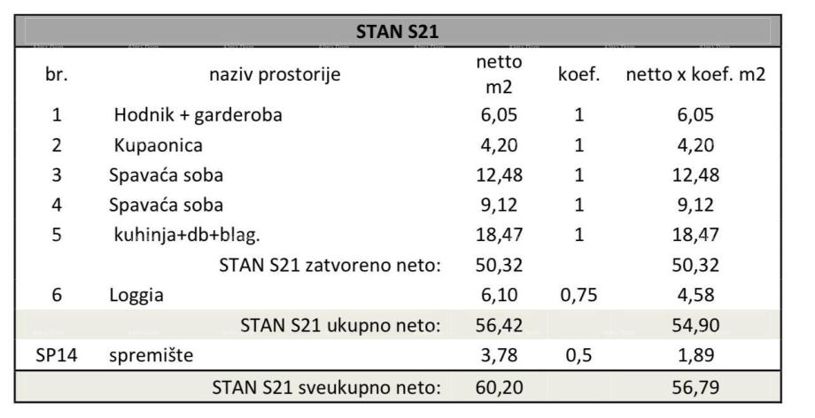 U ponudi je stan na 1. katu višestambene zgrade s liftom. Stan S21 će se sastojati od ulaznog hodnika+garderoba, 2 spavaće sobe, kupaonice, kuhinje s blagavaonom te dnevnim boravkom i loggia.