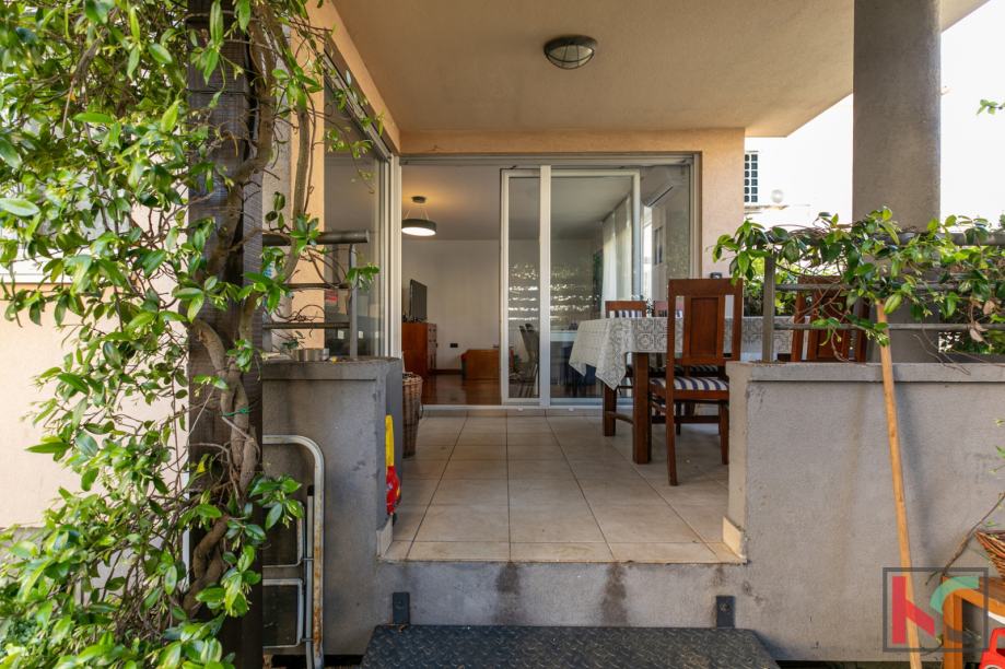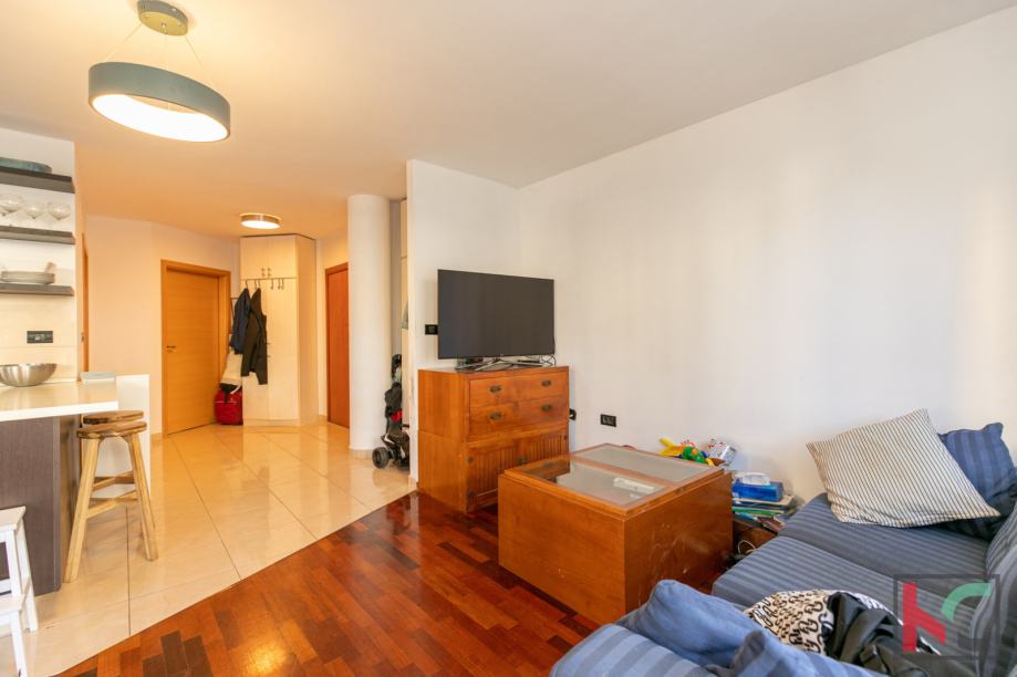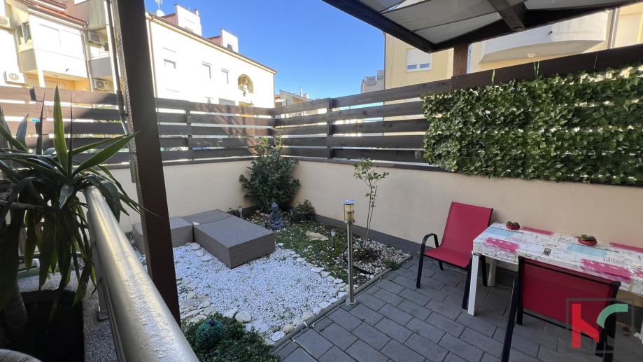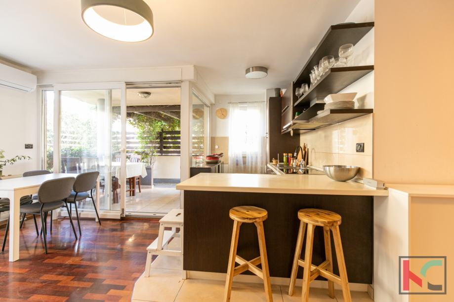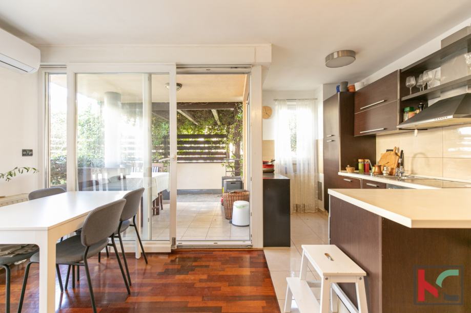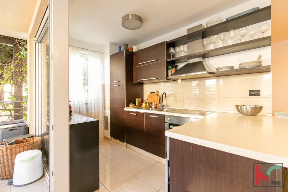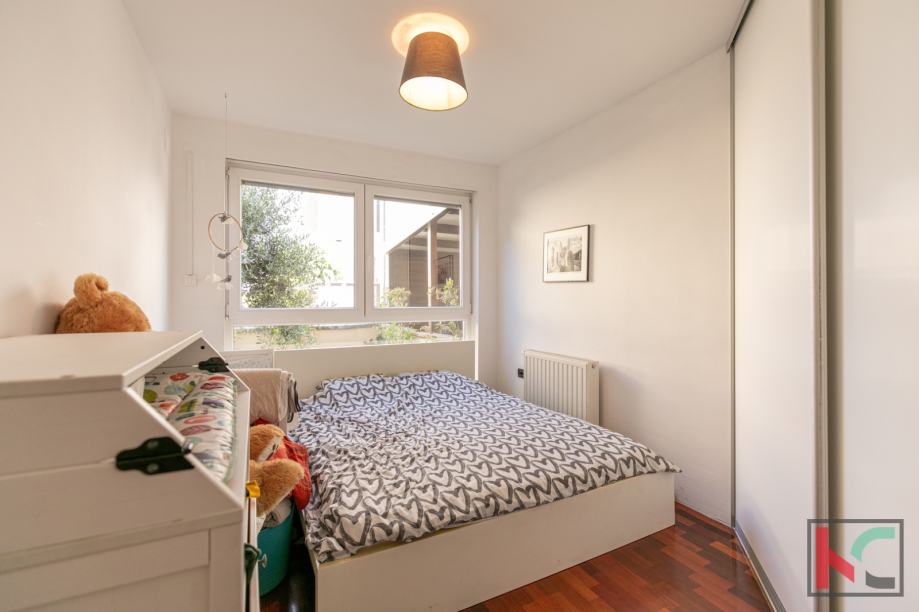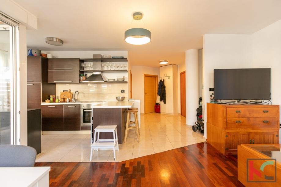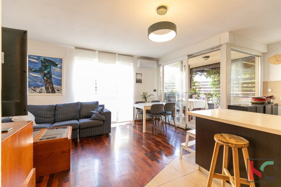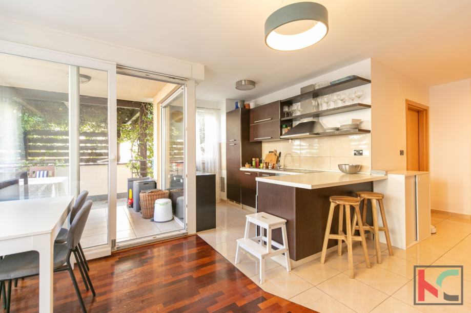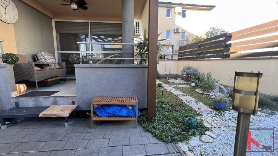 Stan je moderno opremljen s kvalitetnim namještajem, te se prodaje kao takav, PVC stolarija, klimatska jedininica, lijepa unutarnja stolarija te parketi u sobama su neki od aduta ove nekretnine. Parkirno mjesto je u vlasništvu stana a zgrada posjeduje bazen koji je u suvlasništvu stanara.