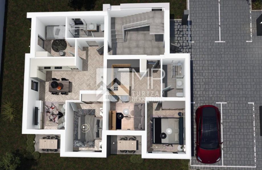 U naselju Monte Turco, smještenom u neposrednoj blizini grada Pule, predstavljamo moderno uređen projekt, čija izgradnja započinje uskoro. Riječ je o samostojećoj stambenoj zgradi sa ukupno 6 stambenih jedinica raspoređenih kroz prizemlje, prvi i drugi kat ( na svakom katu po 2 stana ).