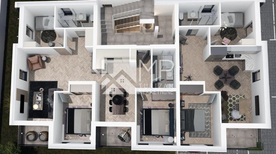 Sastoji se od: dnevnog boravka, kuhinje i blagovaonice, tri spavaće sobe, dvije kupaonice, loggie i natkrivene terase.