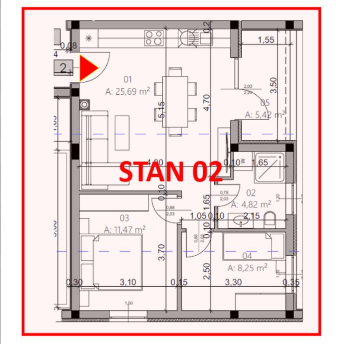 Stan se nalazi u prizemlju zgrade te ima funkcionalan i pažljivo osmišljen raspored. Sastoji se od dvije spavaće sobe, kupaonice i prostranog dnevnog prostora koji objedinjuje kuhinju, blagovaonicu i boravak u otvorenom konceptu. Iz dnevnog dijela izlazi se na balkon, idealan za opuštanje, dok jugoistočna orijentacija omogućuje obilje svjetlosti tijekom dana.
