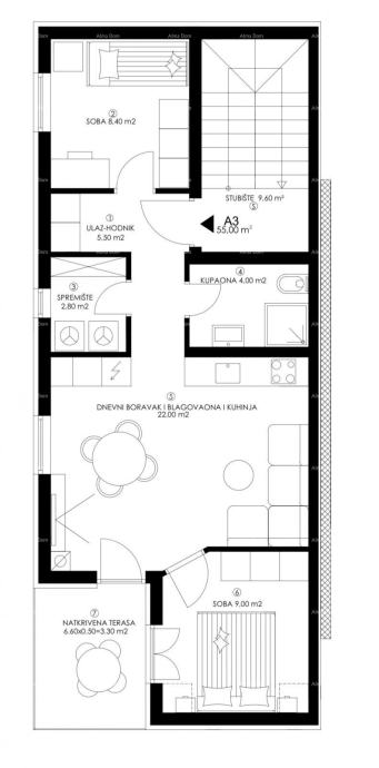 Stan A3 nalazi se na 2 katu zgrade i sastoji se od hodnika, kupaonice, 2 spavaće sobe, spremišta te kuhinje s blagovaonicom i dnevnim boravkom koji imaju izlaz na terasu.