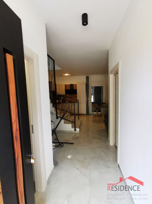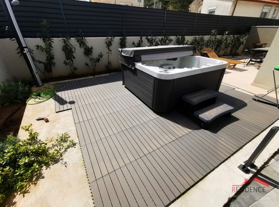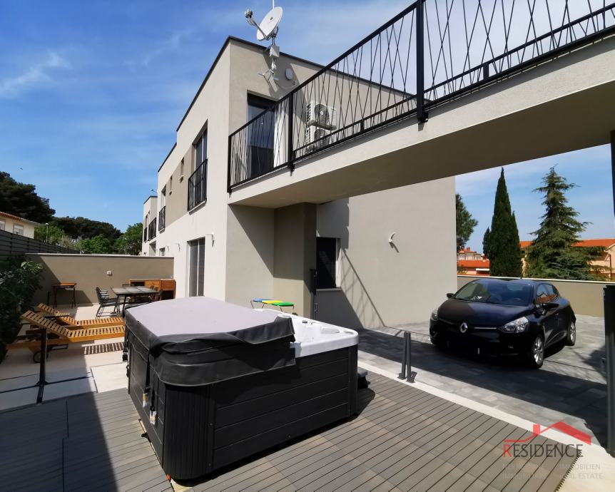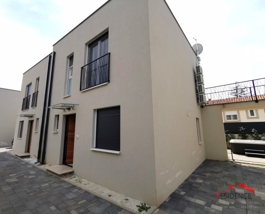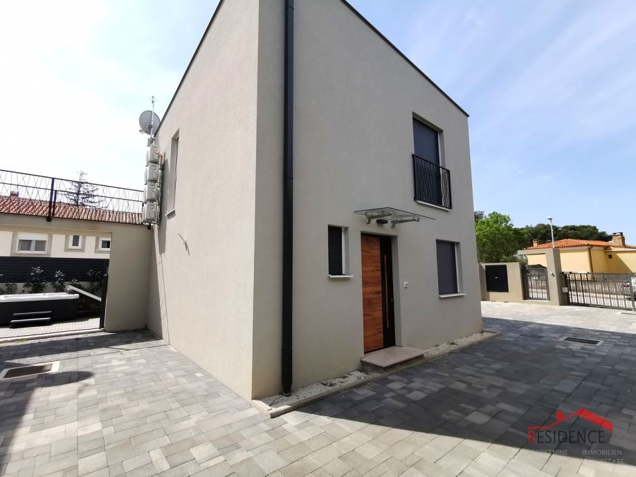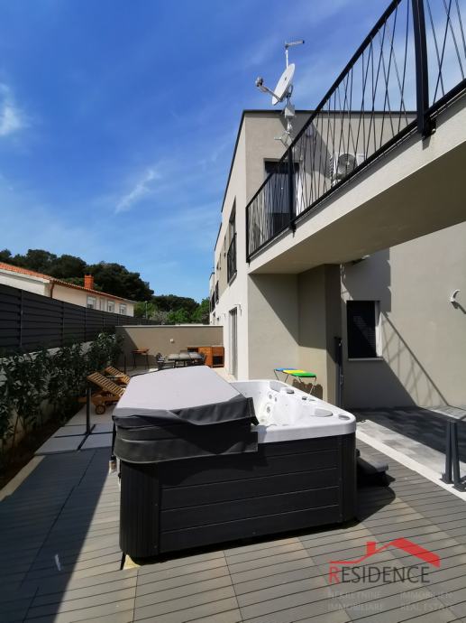 Prodaje se nova dvojna kuća sa jacuzzijem nedaleko od centra Pule u rezidencijalnom dijelu naselja. Kuća je veličine 80 m2 na dvije etaže. U prizemlju se nalazi dnevni boravak sa kuhinjom i blagovaonicom, 1 spavaća soba i kupaonica. Iz dnevnog boravka se izlazi u vrt veličine 50 m2 gdje se nalazi jacuzzi te lijepo uređeni dio za boravak na otvorenom. U prizemlju se nalaze stepenice koje vode na kat kuće na kojem su 2 spavaće sobe i kupaonica. Kuća je kvalitetno građena i kompletno namještena. Prostorije su klimatizirane, a u kupaonicama je podno grijanje.
