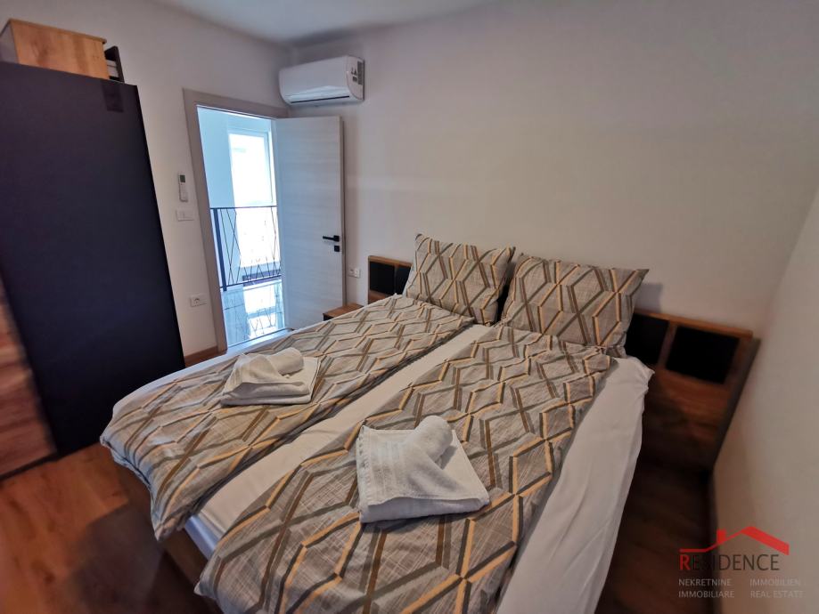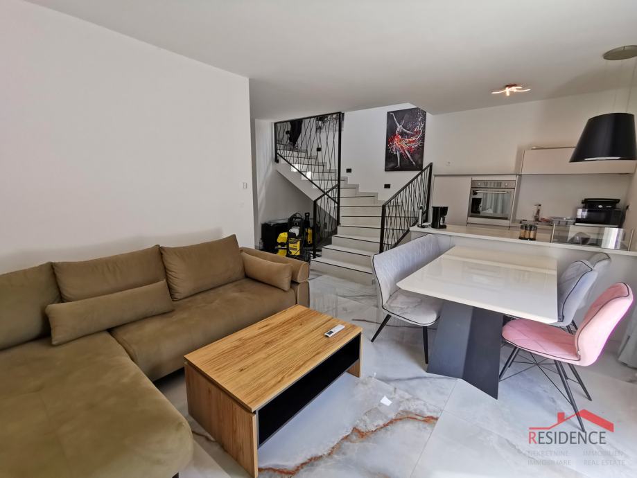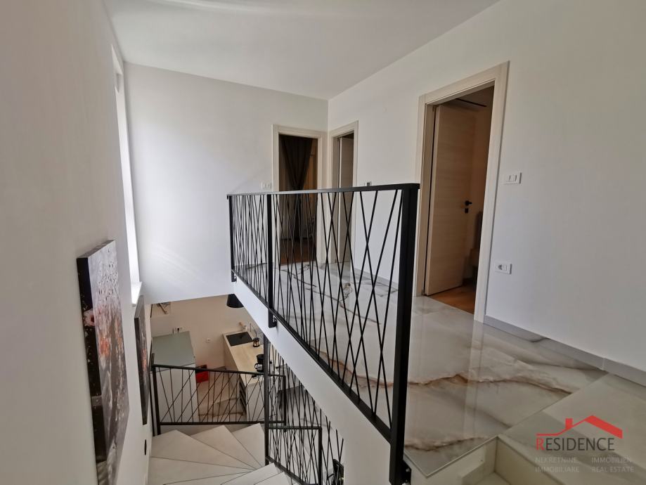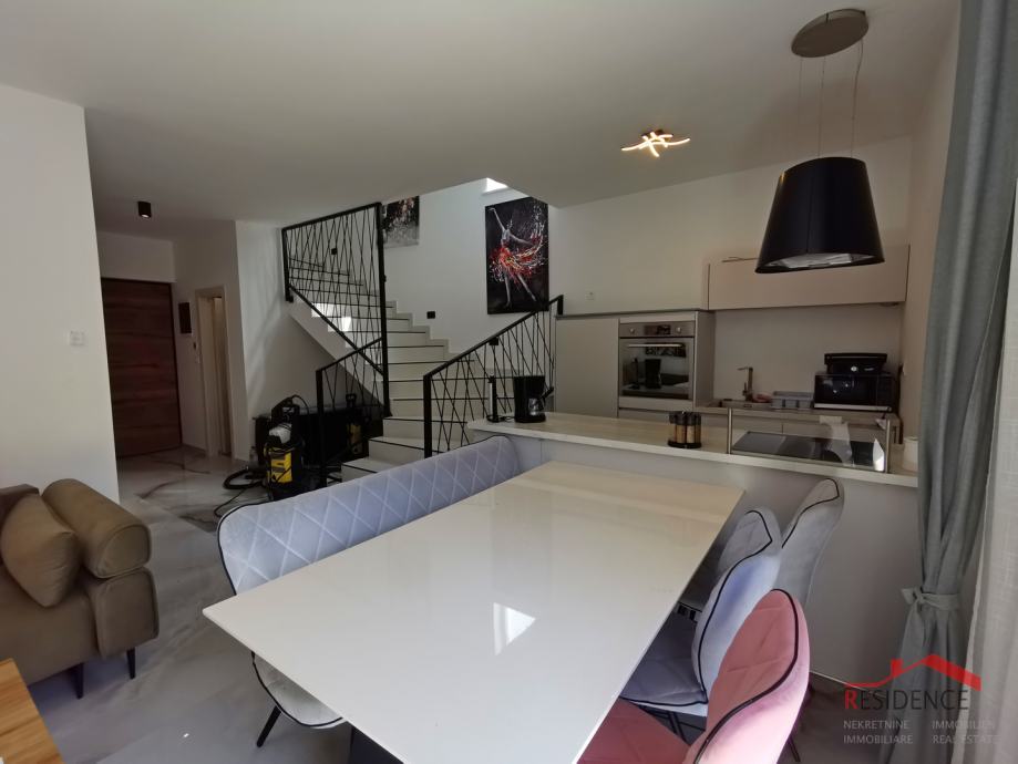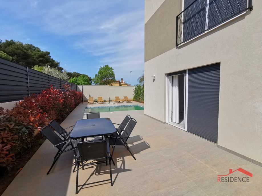 Prodaje se nova kuća sa bazenom nedaleko od centra Pule u rezidencijalnom dijelu naselja. Kuća je veličine 97 m2 na dvije etaže. U prizemlju se nalazi dnevni boravak sa kuhinjom i blagovaonicom, 1 spavaća soba i kupaonica. Iz dnevnog boravka se izlazi u vrt veličine 150 m2 gdje je smješten bazen od 18 m2. U prizemlju se nalaze stepenice koje vode na kat kuće na kojem su 2 spavaće sobe i kupaonica. Kuća je kvalitetno građena i kompletno namještena. Prostorije su klimatizirane, a u kupaonicama je podno grijanje.