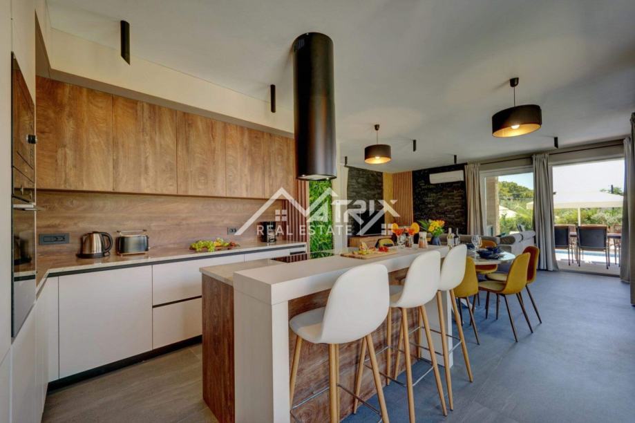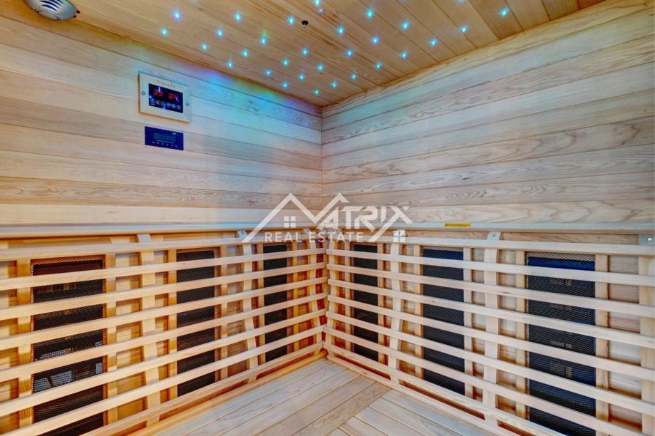 Nekretnina se prostire na dvije etaže i sastoji se od ukupno 4 spavaće sobe, svaka s vlastitom kupaonicom. U prizemlju se nalazi prostran dnevni boravak s izlazom na sunčalište i grijani bazen, potpuno opremljena kuhinja s blagovaonicom te jedna spavaća soba s en-suite kupaonicom. Na katu su smještene dodatne tri spavaće sobe, svaka s kupaonicom i izlazom na terasu, a tu je i wellness zona s hidromasažnom kadom i saunom – savršeno mjesto za opuštanje.
