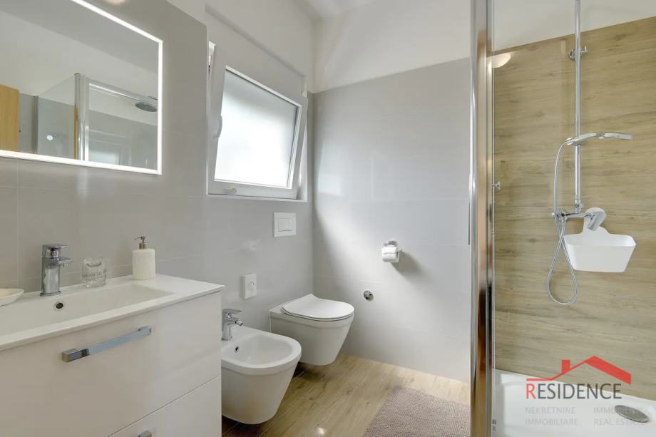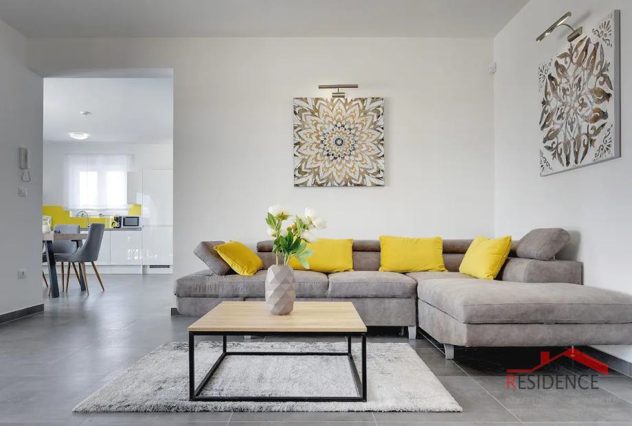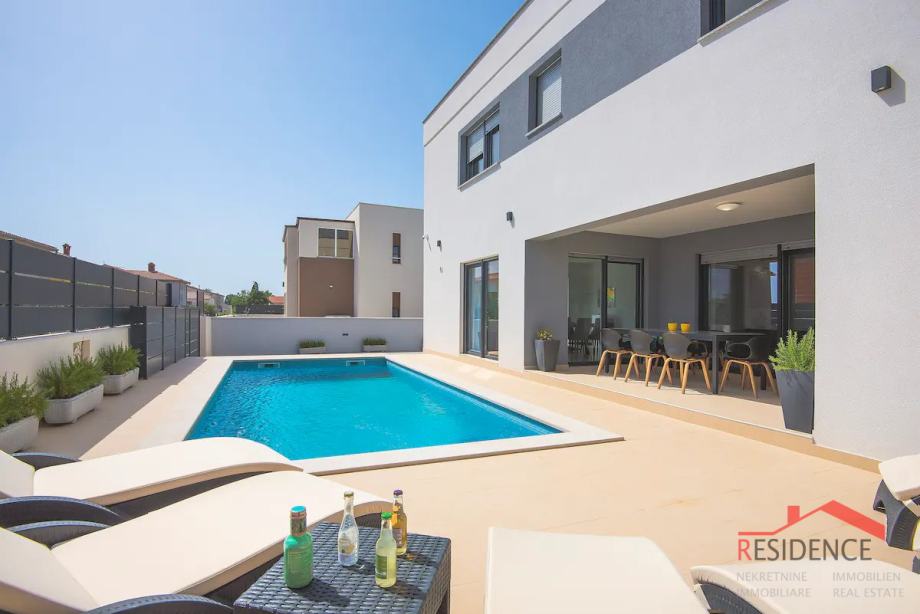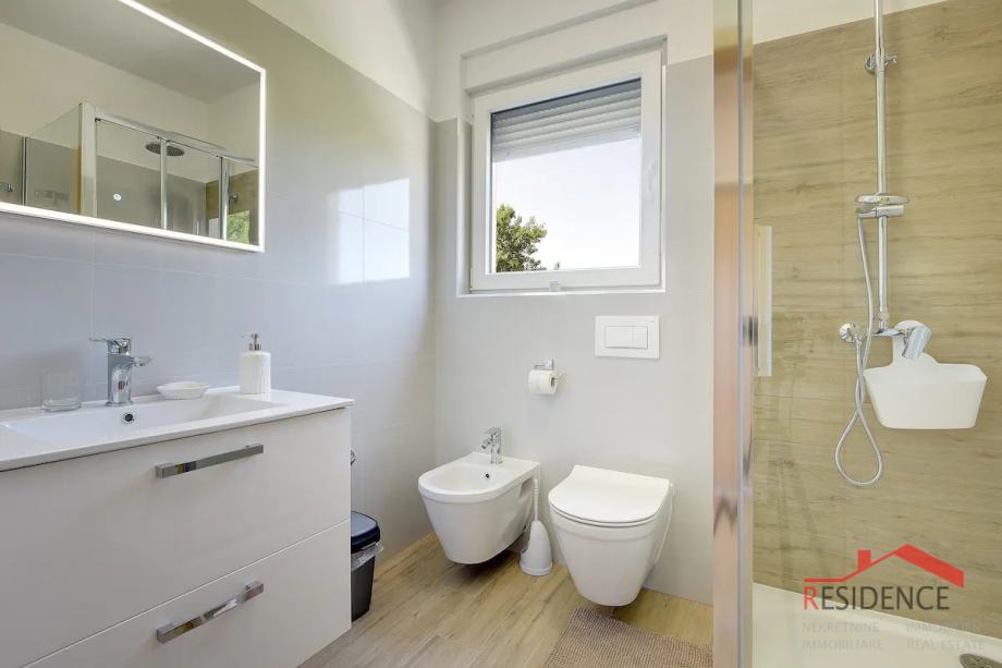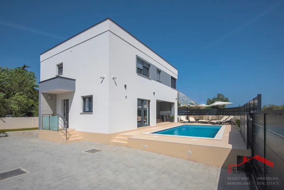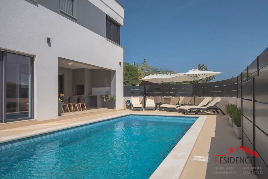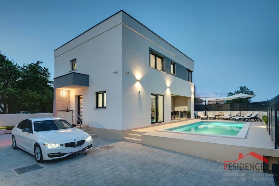 Kuća je ukupne površine 172 m2. Sastoji se od prizemlja s kuhinjom i blagovaonicom koja ima direktni pristup vanjskoj terasi i bazenu, dnevnom boravku i kupaonici te prvog kata s tri spavaće sobe svaka s vlastitom kupaonicom. U dvorištu se nalazi bazen od 32m2 s hidromasažom, sunčalište te vanjska kuhinja s roštiljem. Okućnica 382 m2.