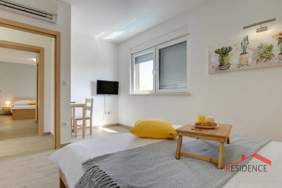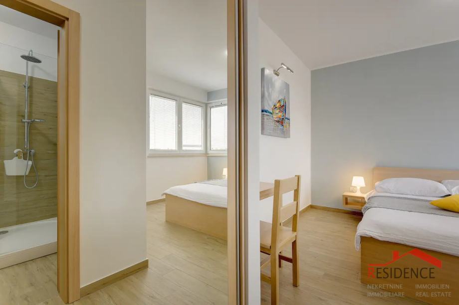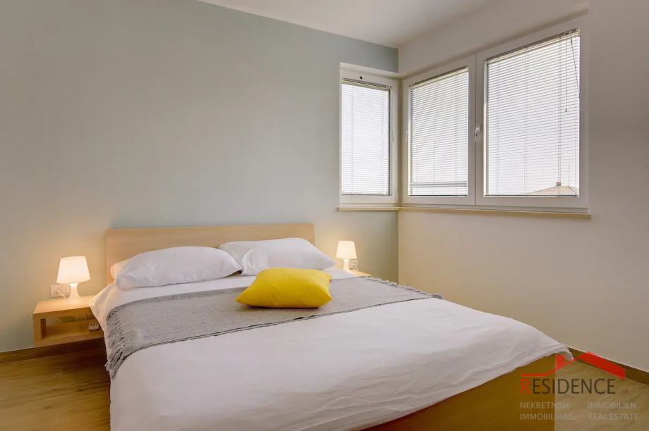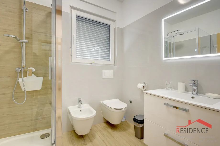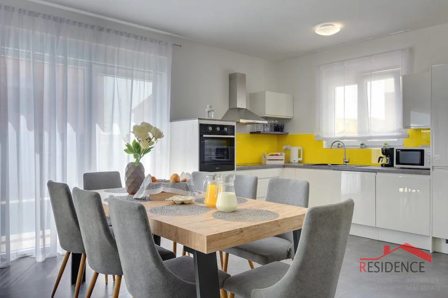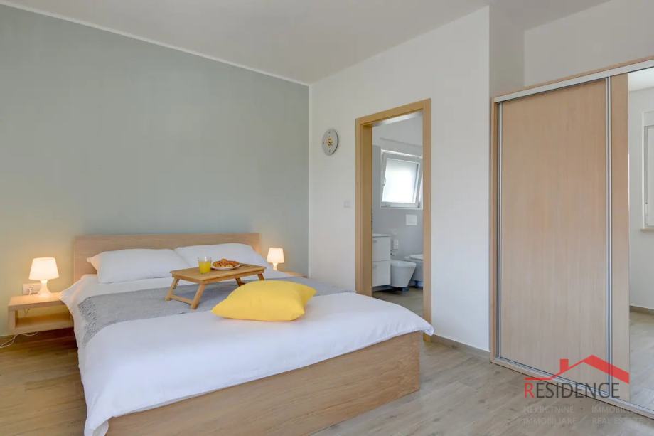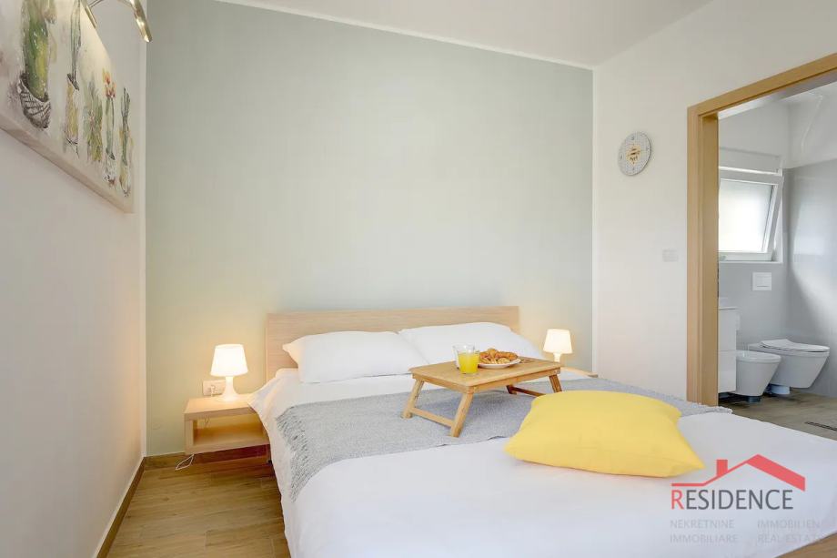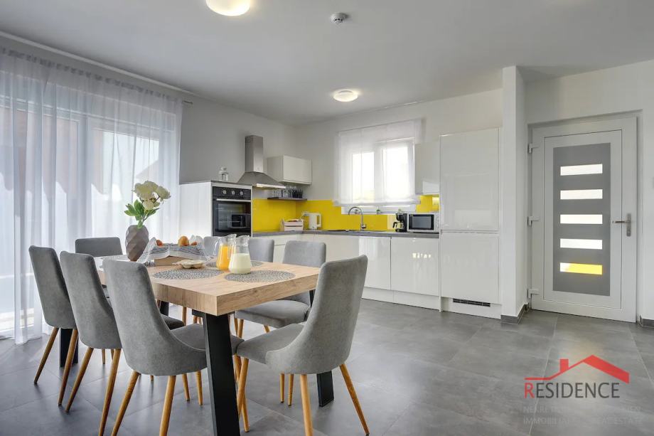 Kuća je ukupne površine 172 m2. Sastoji se od prizemlja s kuhinjom i blagovaonicom koja ima direktni pristup vanjskoj terasi i bazenu, dnevnom boravku i kupaonici te prvog kata s tri spavaće sobe svaka s vlastitom kupaonicom. U dvorištu se nalazi bazen od 32m2 s hidromasažom, sunčalište te vanjska kuhinja s roštiljem. Okućnica 382 m2.