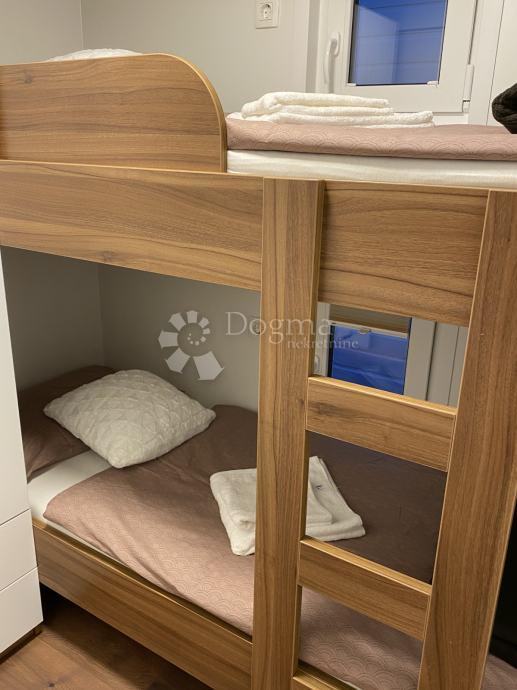Sastoji se od dvevnog boravka povezanog za kuhinjom i blagavaonom, dvije spavaće sobe te kupaonice, neto stambena površina je 32m2. kuća sveukupno ima 3 vanjske terase, ukupne površine 48 m2 (3 terase - 38m2, 6m2 i 4 m2). Na velikoj terasi, roof top terrace, nalazi se sunčalište sa lijepim jacuzzijem, te vrtnim namještajem.