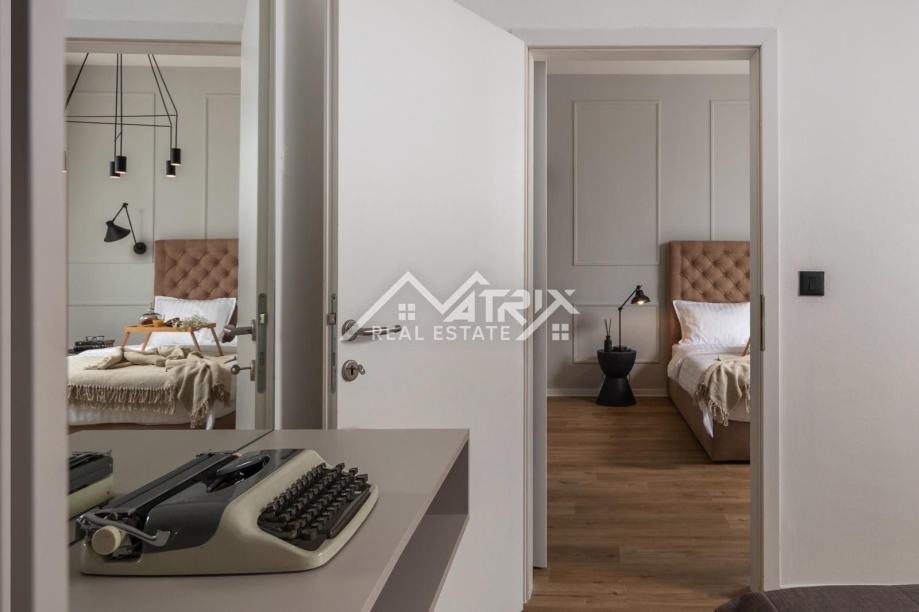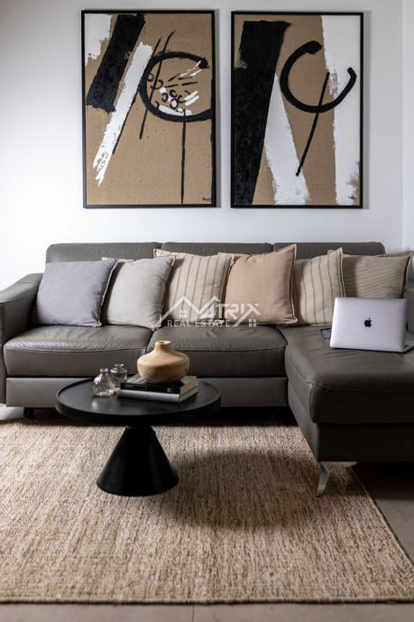 Smješten na drugom katu stambene zgrade, stan se sastoji od prostranog open space prostora koji ujedinjuje dnevni boravak i blagovaonicu. Ovaj otvoreni prostor pruža osjećaj prozračnosti i obilje svjetlosti, stvarajući ugodnu atmosferu za druženje i opuštanje. Uz to, stan ima modernu kuhinju potpuno opremljenu, dvije udobne spavaće sobe te kupaonicu. Dodatno, stanu pripada i prostrano spremište površine 20 m2 u suterenu zgrade. Svaki detalj u stanu je poseban, pažljivo odabran s estetskim osjećajem.