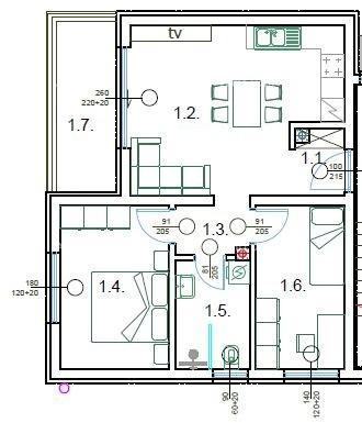 predprostora, dnevnog boravka s kuhinjom i blagovaonom, dvije spavaće sobe, kupaonice te terase.