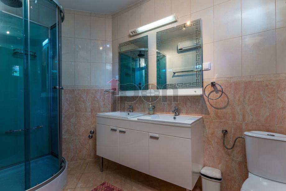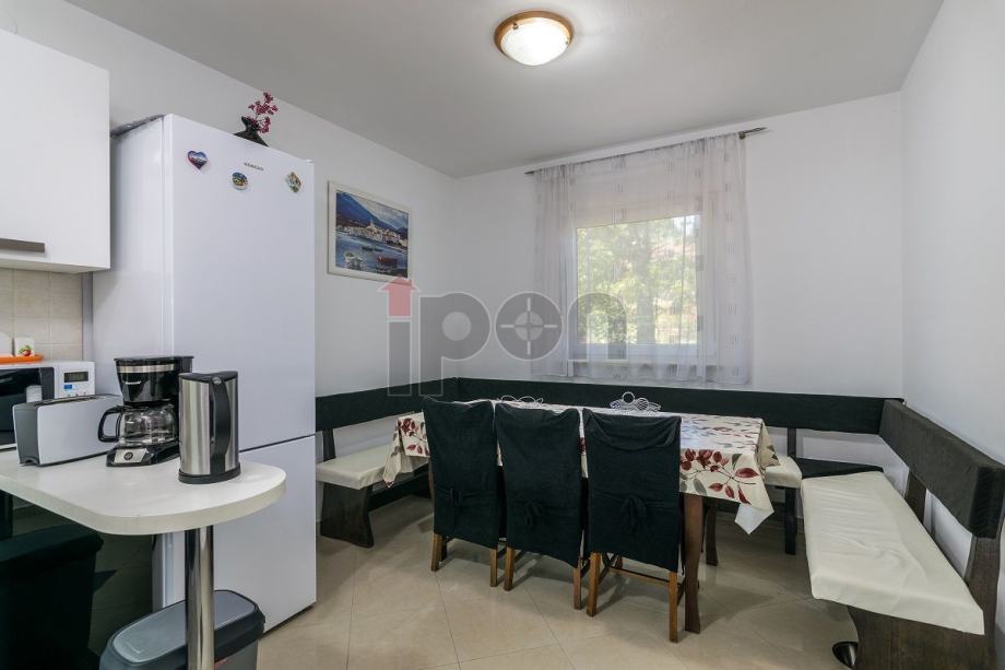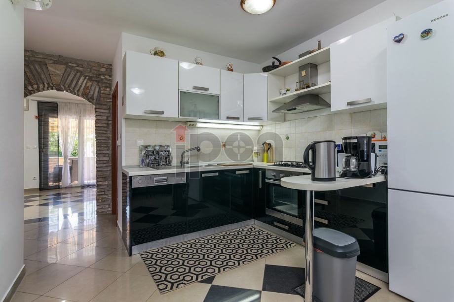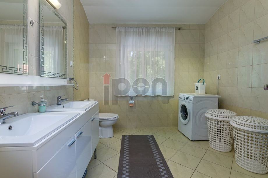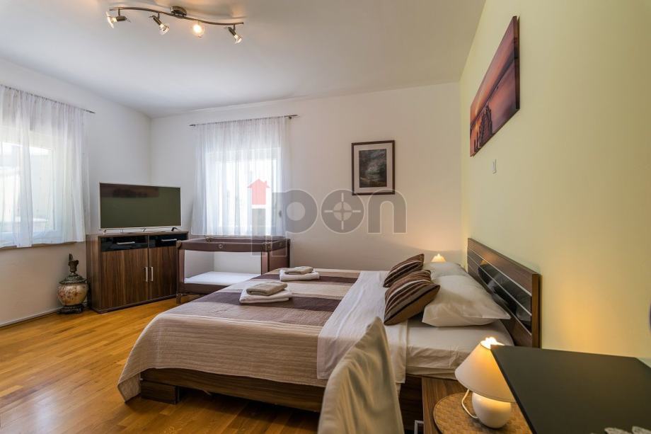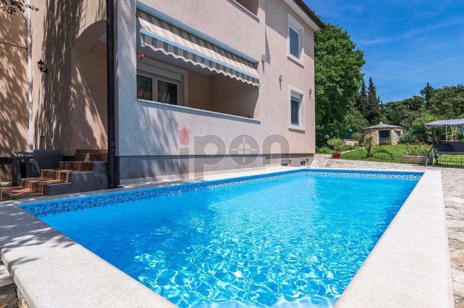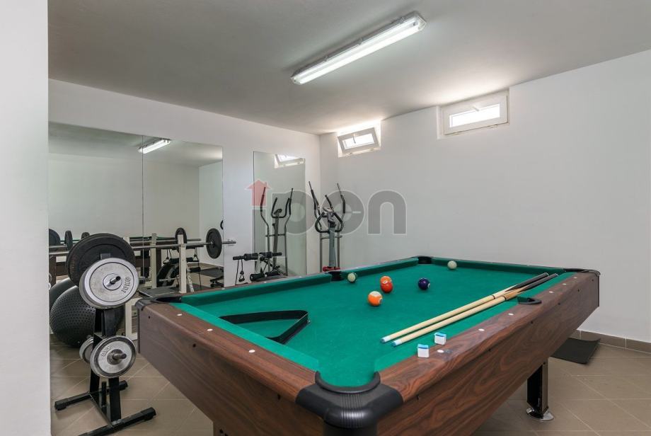 Kuća je potpuno opremljena i klimatizirana sa šest klima uređaja. Dvorište je potpuno ograđeno i uređeno, a na njemu se bazen 28m2 koji obećava ugodno osvježenje u ljetnim mjesecima, kameni roštilj, travnjak, te kamenu kućicu koja služi kao spremište za ležaljke za bazen, bicikle, i slično.