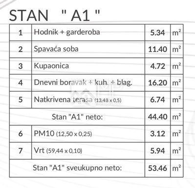 Na prodaju je jednosoban stan oznake „A1“ koji se nalazi u prizemlju zgrade ukupne površine 53,46 m2.