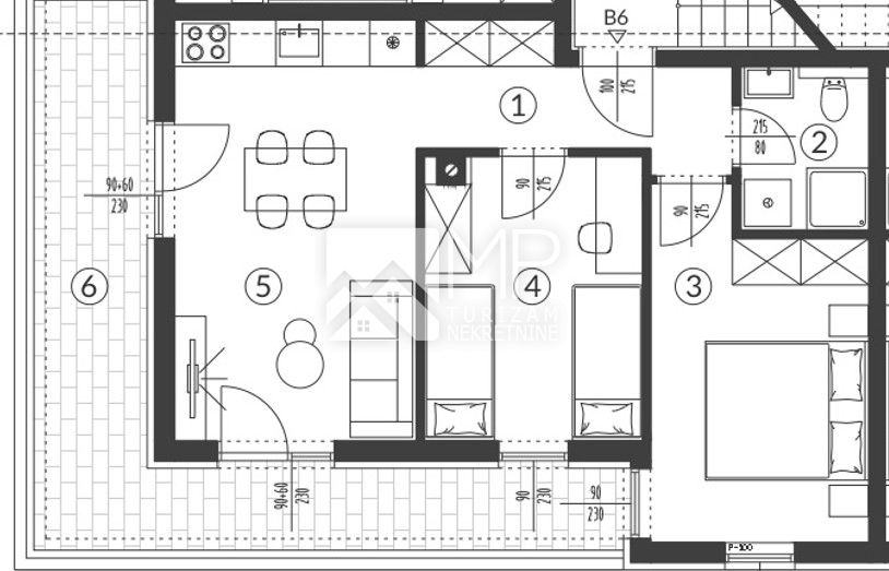 Stan se ističe funkcionalnim i dobro osmišljenim rasporedom, pružajući udobnost i privatnost u dvije spavaće sobe, što je rijetkost u novogradnji ove kvadrature. Veliki stakleni elementi omogućuju obilje prirodnog svjetla, a dnevni boravak ima direktan izlaz na prostranu natkrivenu terasu, idealnu za opuštanje i druženje. U cijenu je uključeno parkirno mjesto, a kupci su oslobođeni plaćanja poreza na promet nekretnina.