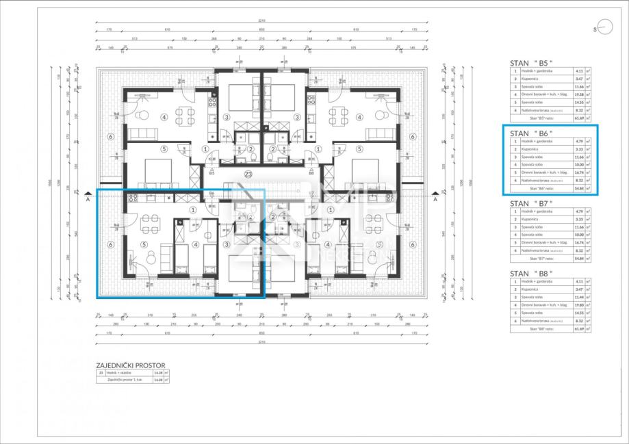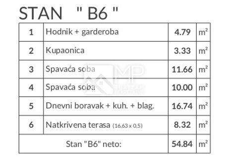 Na prodaju je funkcionalno raspoređen dvosoban stan u novogradnji (oznaka: B6), ukupne neto površine 54,84 m², uz pripadajuće parkirno mjesto PM3 (3,12 m²), što čini ukupnu obračunsku površinu od 57,96 m².