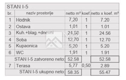 Predmetni stan oznake "I-5" nalazi se na I. katu zgrade ( 55,47 m2 ), a sastoji se od hodnika, kuhinje s blagovaonicom i dnevnim boravkom, spavaće sobe, kupaonice, wc-a i terase.