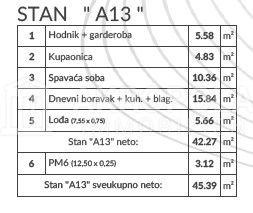 Stan se sastoji od: dnevnog boravka sa kuhinjom i blagovaonom, kupaona, hodnik, 1 spavaća soba ,lođa i parkirno mjesto