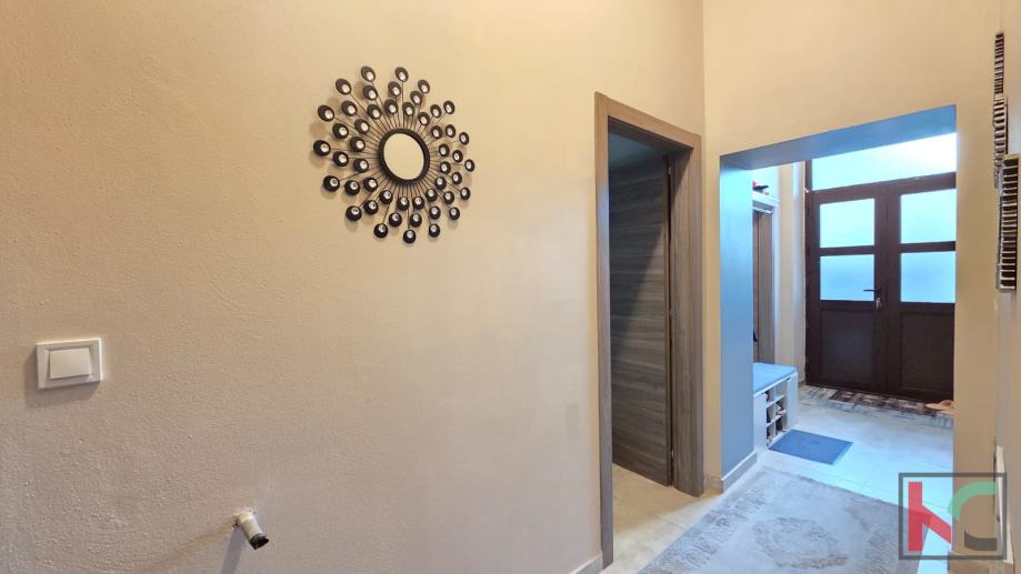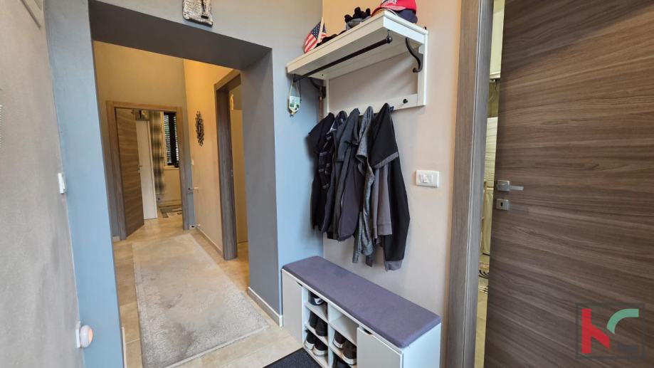 Ulaskom u stan dolazi se u prostrani ulazni prostor koji ima izlaz na prednje dvorište. Stan raspolaže s tri udobne spavaće sobe odvojene od dnevnog dijela pa pružaju dovoljno privatnosti i mira, uređenom kupaonicom te otvorenim konceptom dnevnog boravka povezanog s kuhinjom i blagovaonicom, stvarajući ugodan i funkcionalan prostor idealan za obiteljski život i druženja. Zahvaljujući orijentaciji na istok, jug i zapad prostor je izuzetno svijetao i ugodan tijekom cijelog dana.