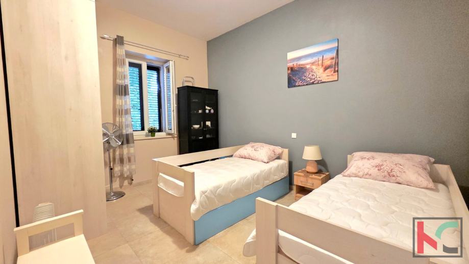Dodatnu vrijednost ovoj nekretnini daje priprema za centralno grijanje na kruta goriva. Kvalitetna PVC stolarija koja osigurava odličnu toplinsku i zvučnu izolaciju, kao i privatno dvorište površine 40 m2. Uz stan dolaze i dva parkirna mjesta ispred same zgrade, što je prava rijetkost na ovako atraktivnoj lokaciji. Nekretnina se prodaje potpuno namještena i opremljena, spremna za trenutno useljenje bez ikakvih dodatnih obveza.