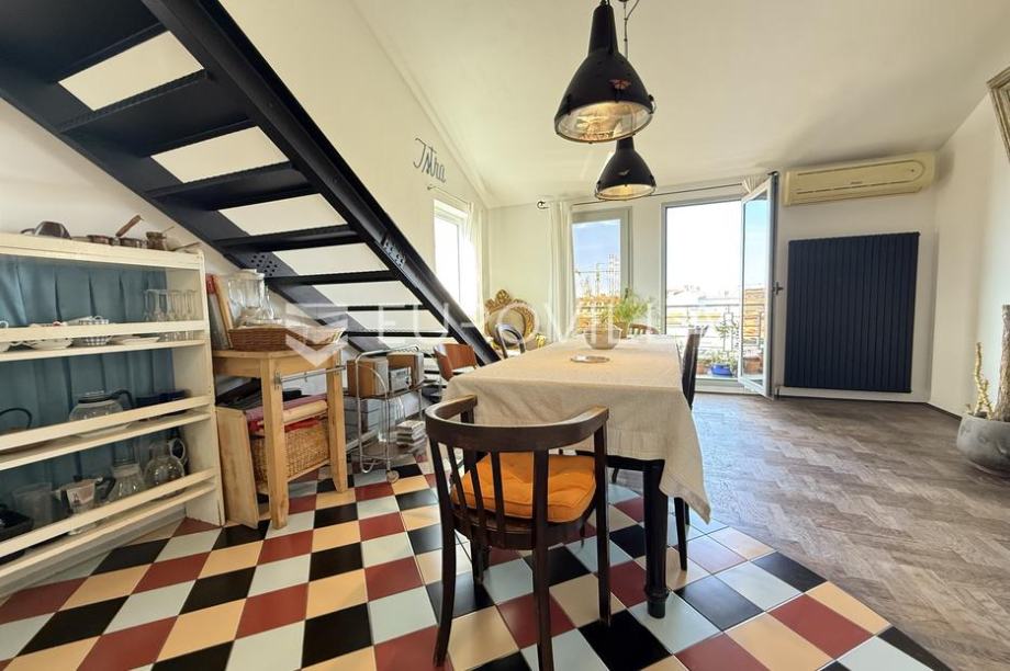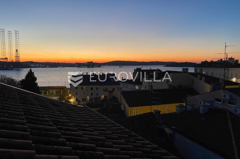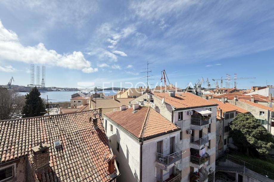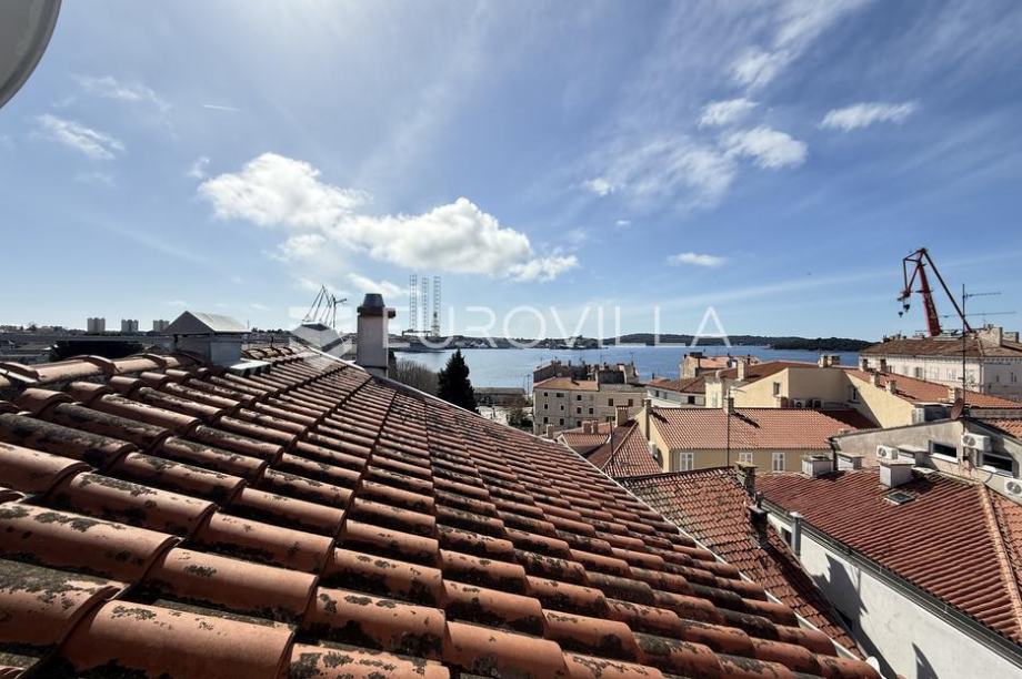 Located in the very center of Pula, in the pedestrian zone and not far from the Forum, this beautiful and sunny, two-story designer apartment with an open view of the sea is for sale. The apartment is located on the fourth floor of a well-maintained residential building. It consists of an entrance...