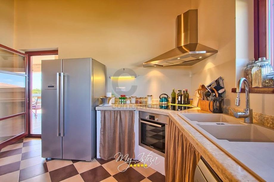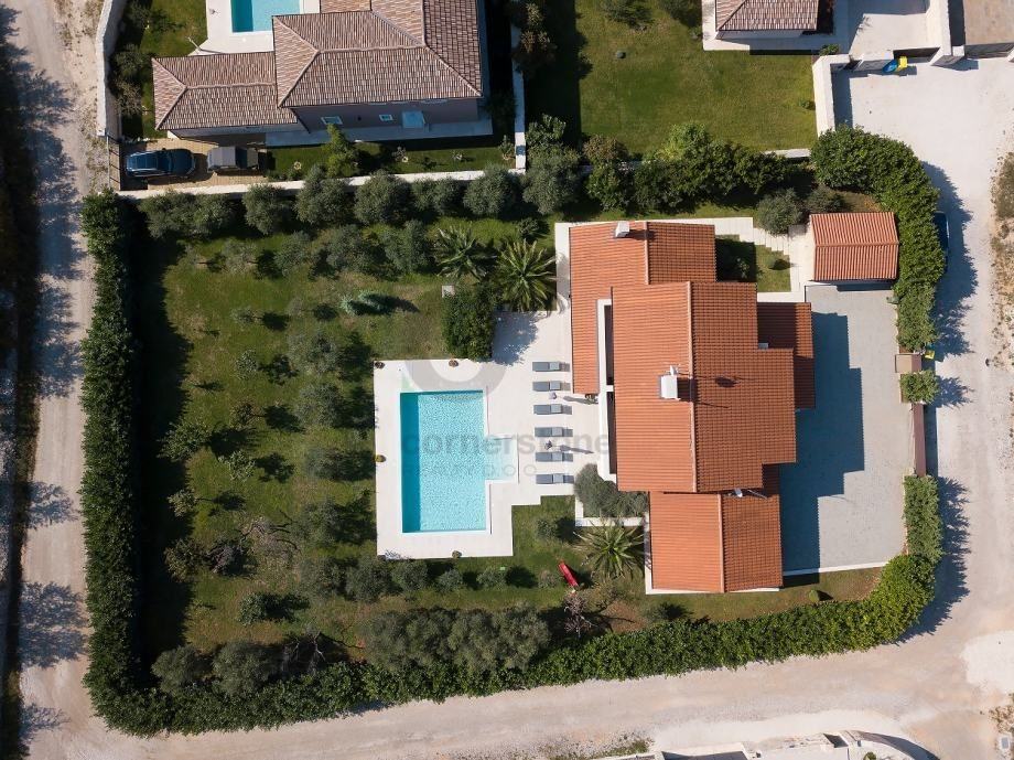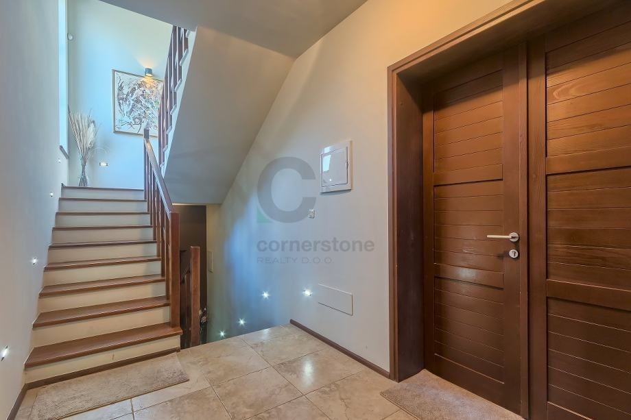 Kuća je sagrađena 2013. godine te se sastoji od 3 etaže: podrum, prizemlje i kat. U podrumu se nalazi konoba i vinoteka. U prizemlju je dnevni boravak, kuhinja, spavaća soba sa svojom kupaonicom, spremište, dodatni toalet i velika terasa. Na katu su dvije spavaće sobe (svaka sa svojom kupaonicom i svaka sa svojim balkonom). U dvorištu je moguće parkirati 6 osobnih vozila, a dodatno postoji i garaža s drvarnicom od 50 m2. Cijela je parcela ograđena (dijelom je ograda od armiranog betona, a dijelom je suhodiz)
