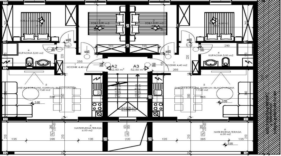 Stan A3 neto površine 52.5 m² nalazi se na 1. katu stambene zgrade. Sastoji se od hodnika, dnevnog boravka s kuhinjom, dvije spavaće sobe, kupaonice te natkrivene terase.