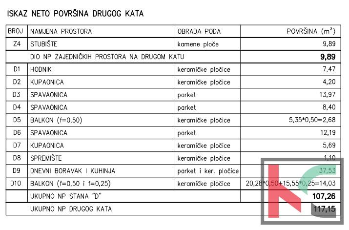 Stan je smješten na drugom katu i obuhvaća 107,26 m2 površine a sastoji se od ulaznog hodnika, kuhinje s dnevnim boravkom s izlazom na prostranu terasu, kupaonica, prva spavaća soba sa izlazom na balkon, druga spavaća soba sa vlastitom kupaonicom te još jedna dodatna soba, ostava u prizemlju, garaža i dodatno parkirno nenatkriveno mjesto te vrt od cca. 20 m2 vlasništvu.