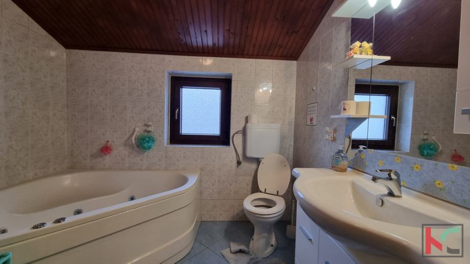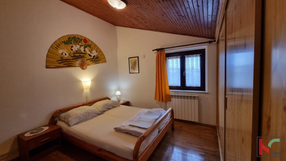 U prizemlju kuće nalaze se dva stana površine 46,70m2. Sastoje se od hodnika, jedne spavaće sobe, dnevnog boravka, kupaone i kuhinje sa blagovaonicom. U prizemlju se također smjestila i ljetna kuhinja površine 22,33m2 koja je izvedena kao još jedna stambena jedinica, sa kupaonicom, spavaćom sobom i kuhinje sa blagovaonicom . Sve tri jedinice imaju izlaz na natkrivenu terasu i vrt u kojem se nalazi bazen sa sunčalištem, kameni roštilje te natkriveni prostor za odmor sa vrtnom garniturom, a upotpunjuju ga prekrasna stabla maslina. Do četvrtog stana na prvom katu vode vanjske stepenice sa direktnim pristupom na gornju natkrivenu terasu orijentiranoj ka vrtu. Ovaj stan površine 110,63 m2 sastoji se od hodnika, dvije kuhinje sa blagovaonicom, dvije kupaonice, tri spavaće sobe i dnevnog boravka sa izlazom na terasu. Na drugom katu nalazi se peti stan površine 76,16m2 te se sastoji od hodnika, dvije spavaće sobe, kuhinje sa blagovaonicom i dnevnog boravka sa izlazom na zatvorenu lođu sa pogledom na prirodu koja okružuje kuću. Također u sklopu kuće nalazi se garaža, šupa te pet parkirnih mjesta.