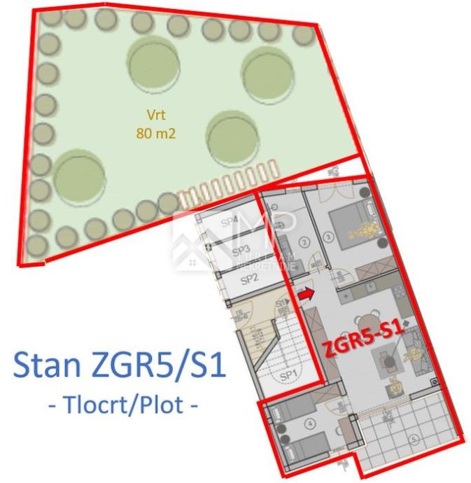 Stanu pripada dio vrta površine 80m2 na korištenje , parkirno mjesto P1 i spremište Sp1.