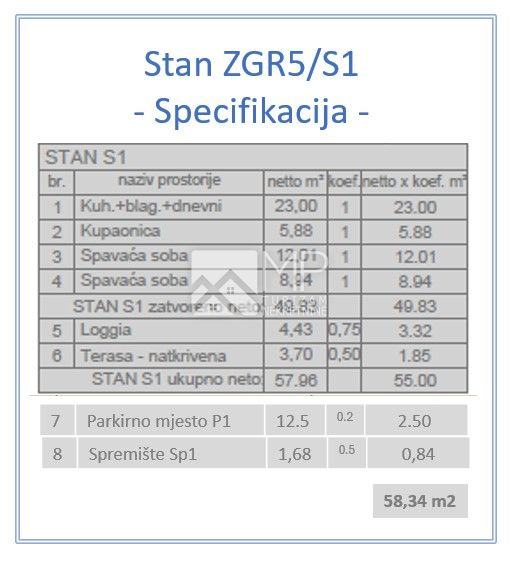 Na prodaju je stan u zgradi broj 5/oznake S1 u prizemlju, sveukupne površine 58,34 m2 raspoređenih na sljedeći način: