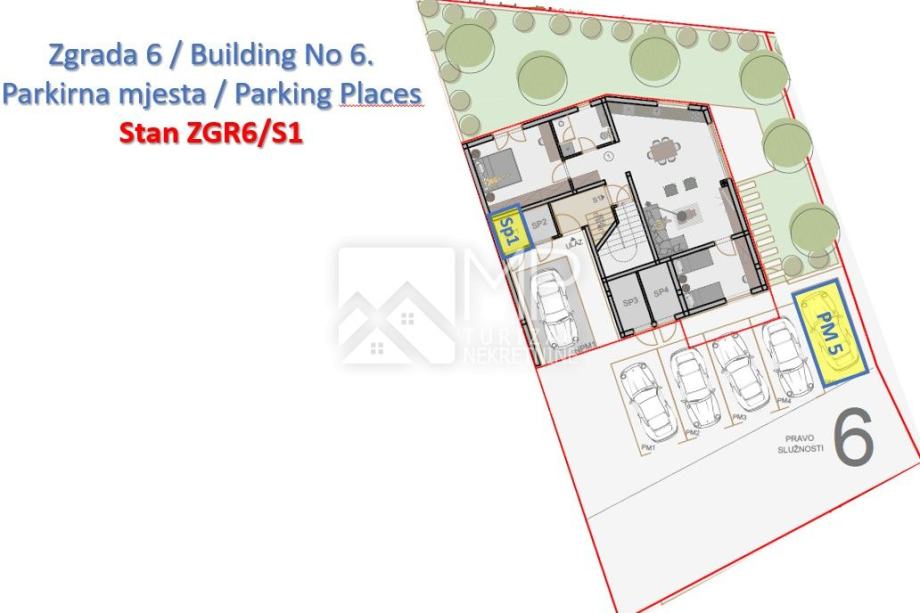 Stanu pripada dio okućnice od 75m2 na korištenje, kao i parkirno mjesto oznake P5 i spremište Sp1.
