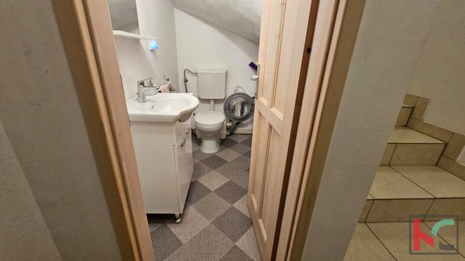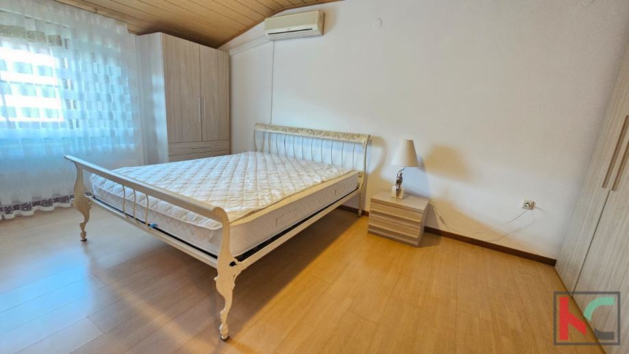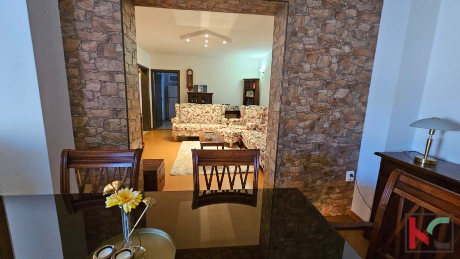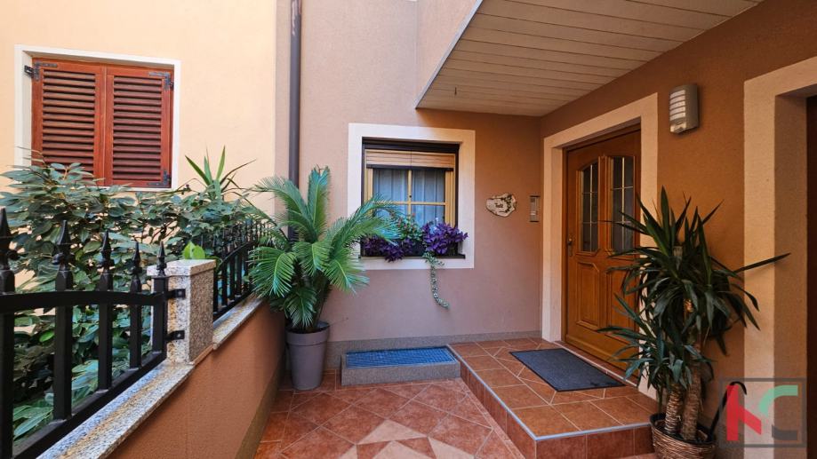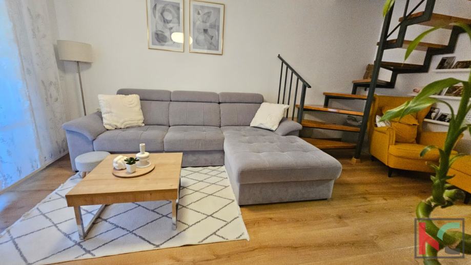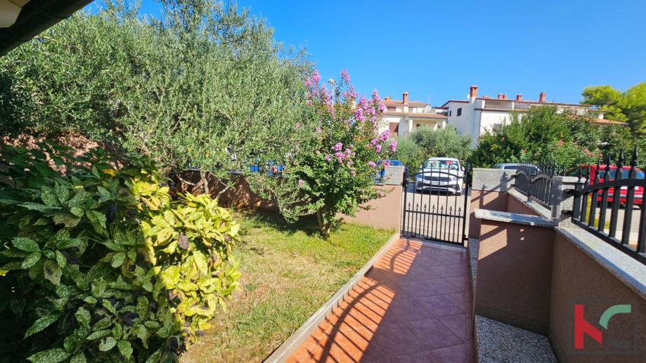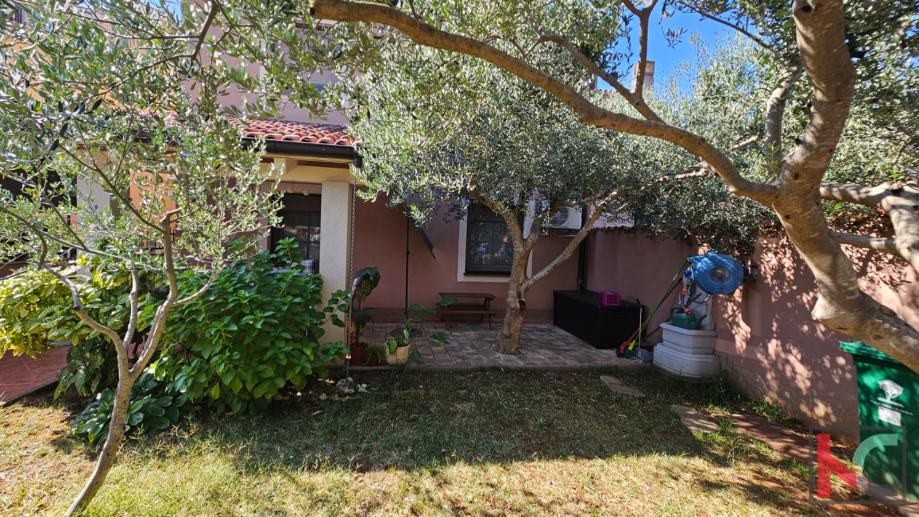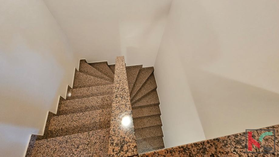 Iz dnevnog boravka stepenice vode na kat gdje su dvije spavaće sobe, kupaonica i terasa. Ispred stana je vrt od cca. 35 m2 s dvije masline ,djelomično popločan, a djelomično uredan travnjak.