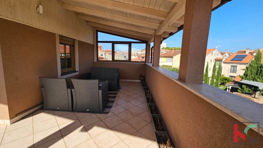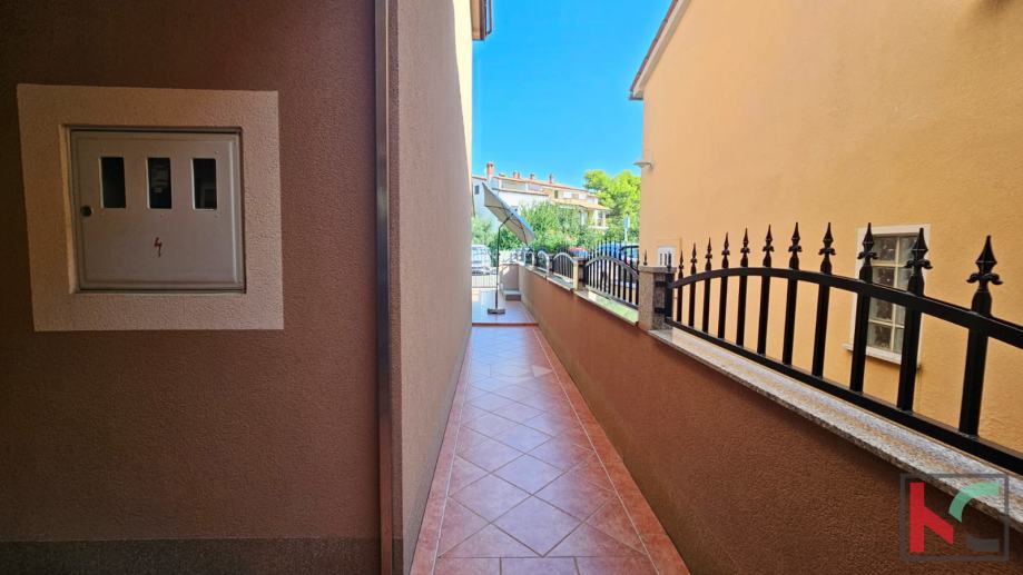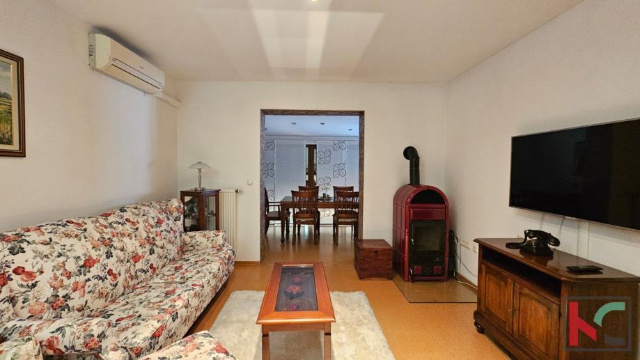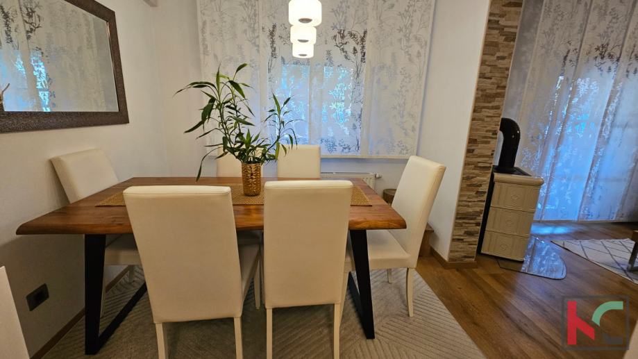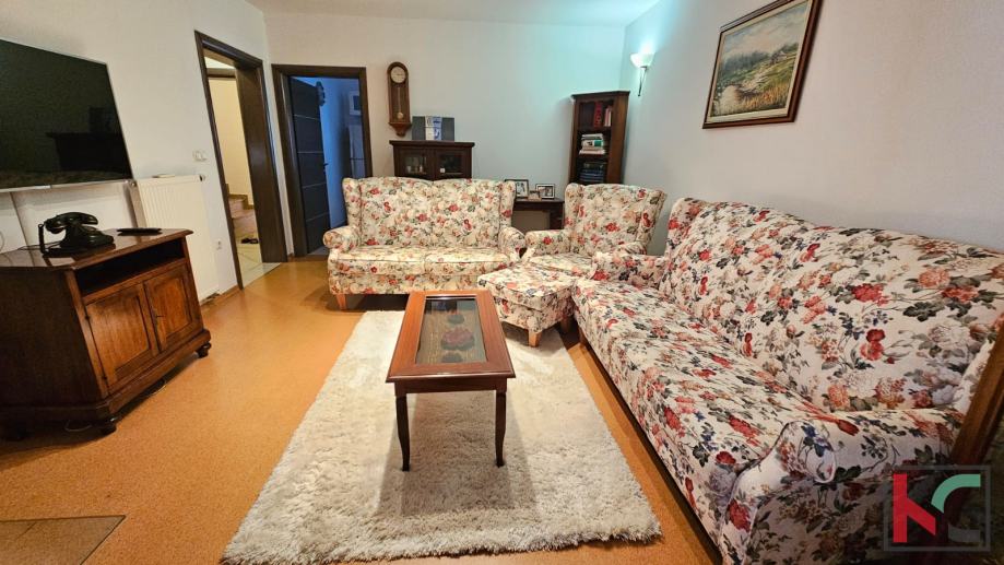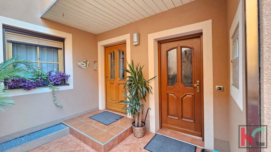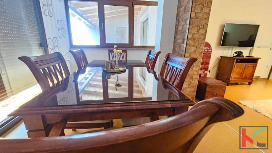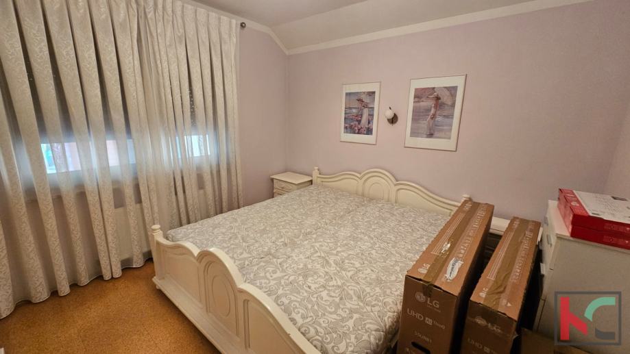 Iz dnevnog boravka stepenice vode na kat gdje su dvije spavaće sobe, kupaonica i terasa. Ispred stana je vrt od cca. 35 m2 s dvije masline ,djelomično popločan, a djelomično uredan travnjak.