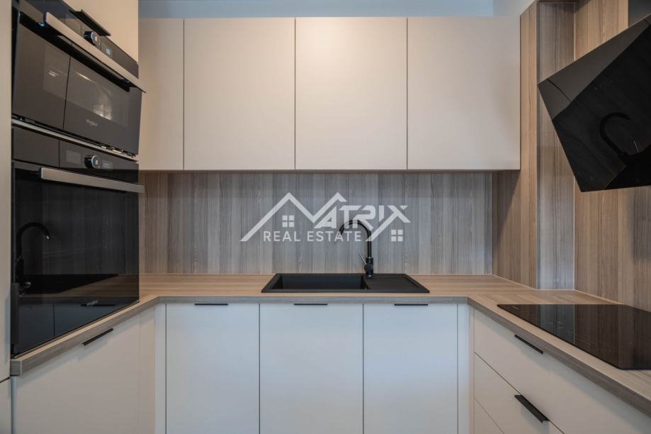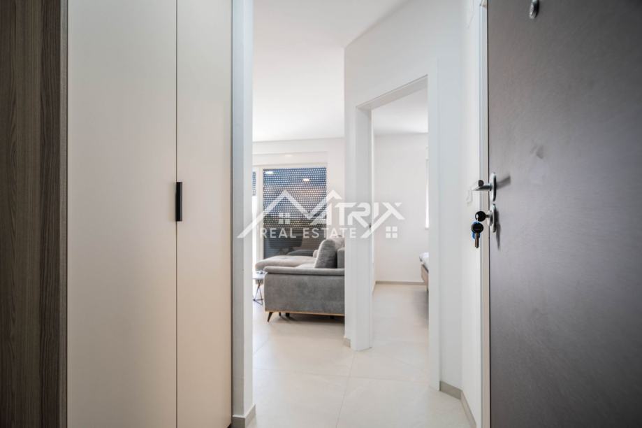 Tlocrt je iznimno funkcionalan i moderan – open space kuhinja, blagovaonica i dnevni boravak čine ugodnu, prozračnu cjelinu, uz odvojenu spavaću sobu, kupaonicu i hodnik. Posebna prednost je predivan balkon okrenut na sunčanu stranu, pa je prostor tijekom dana prirodno osvijetljen i topao, idealan za jutarnju kavu ili opuštanje nakon posla.