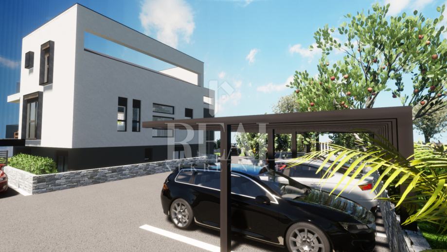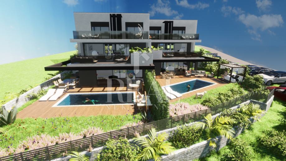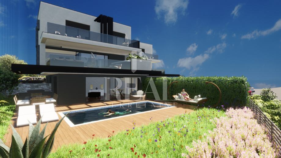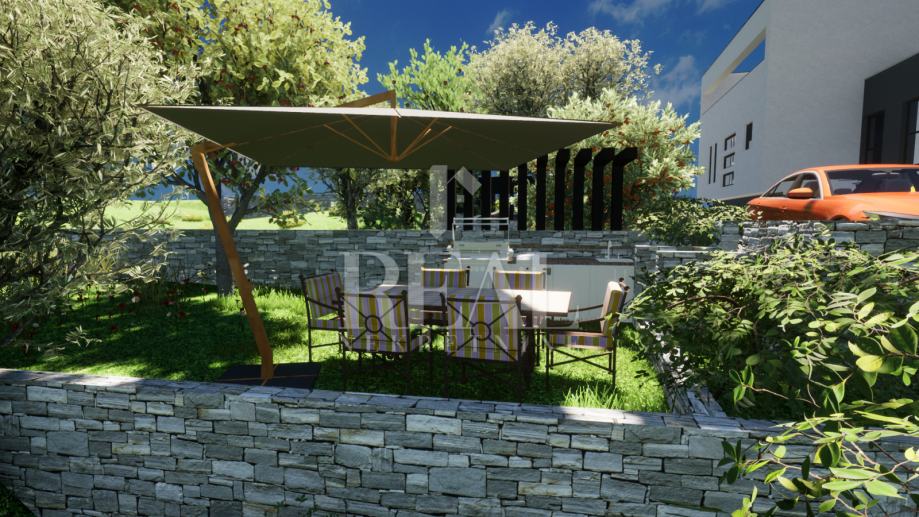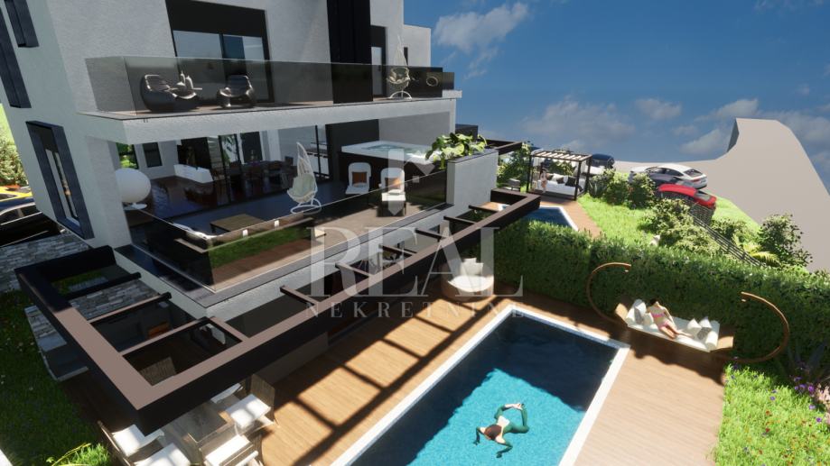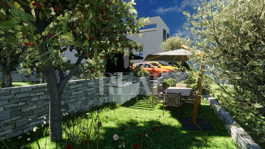 Dvoetažni apartman na atraktivnoj lokaciji udaljen od mora svega 200 m ,površine 137 m2 koji se sastoji od hodnika, kuhinje sa blagovaonom, dnevnog boravka ,wc i terase sa swim spa jacuzziem na katu i master sobe sa kupaonom, dvije spavaće sobe, kupaona i terasa sa pogledom na more u potkrovlju. Apartmanu pripada okućnica 100 m2 i dva parkirna mjesta. Nekretnina vrijedna pažnje. Predviđeni rok završetka radova i useljenja kraj 2025.
