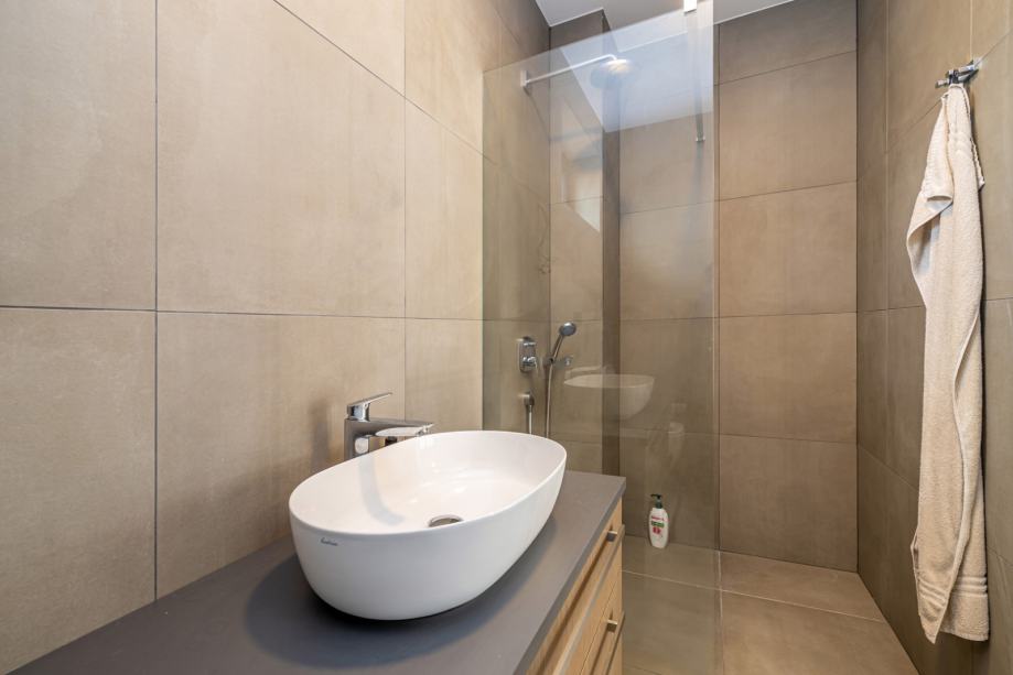 Unutarnjim stepeništem dolazimo u prizemlje gdje su se smjestili kuhinja s blagovaonicom i dnevnim boravkom, WC te ostava. Iz prizemlja se izlazi na natkrivenu terasu, bazen i okućnicu. Iz prizemlja se penjemo na kat. Tu se nalaze hodnik, tri spavaće sobe i dvije kupaonice te izlaz na natkrivenu terasu. Pogled na more pruža se sa kata i iz prizemlja. Kuća je u potpunosti namještena i opremljena.