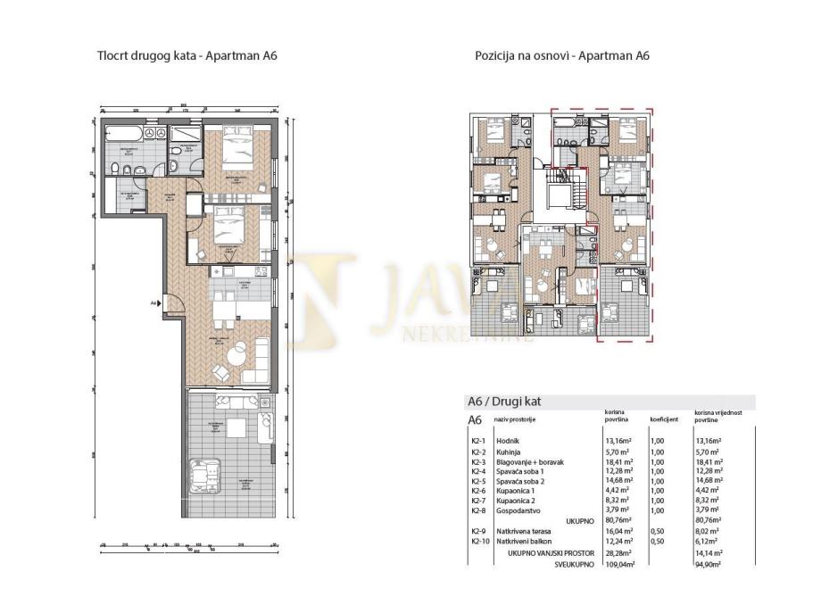 * Sastoji se od 2 spavaće sobe, hodnika, dnevnog boravka s kuhinjom i blagovaonicom, 2 kupaonice te natkrivene terase i balkona