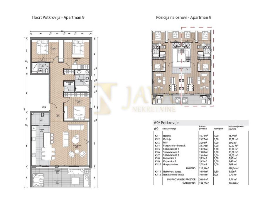 * Sastoji se od 3 spavaće sobe, hodnika, dnevnog boravka s kuhinjom i blagovaonicom, 2 kupaonice, izbe te natkrivene i nenatkrivene terase