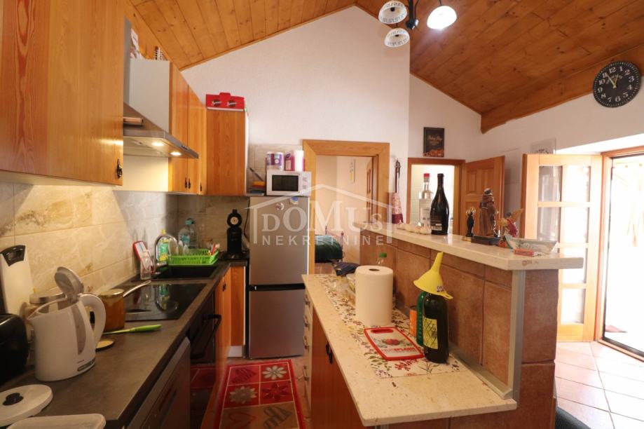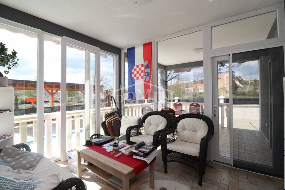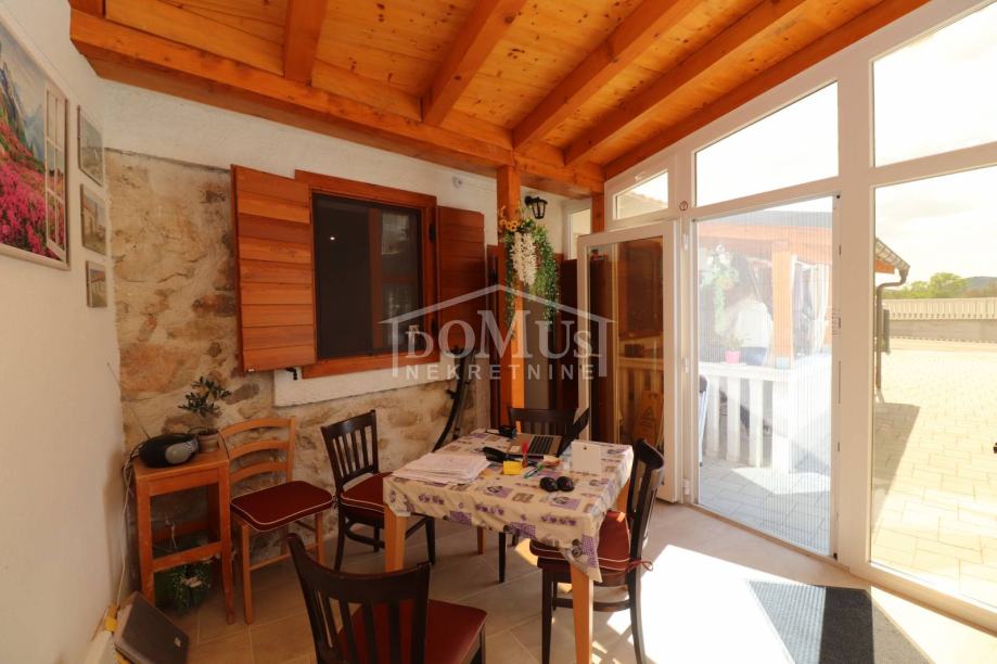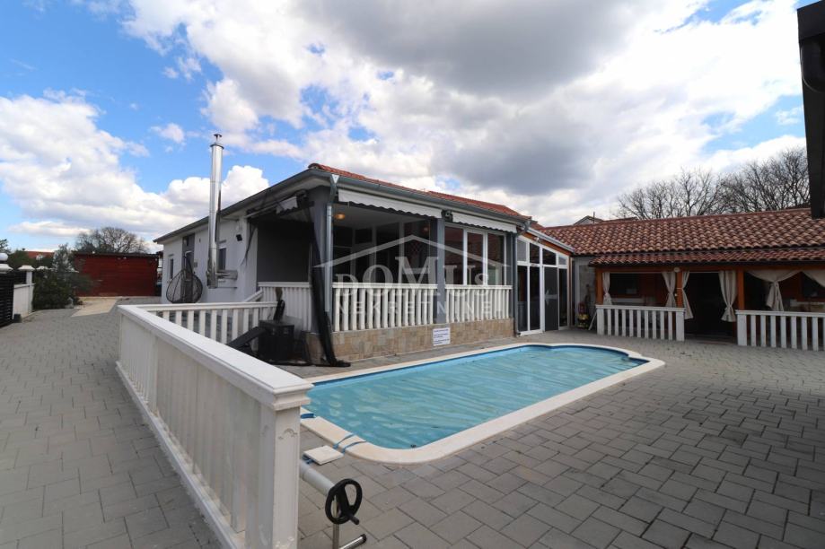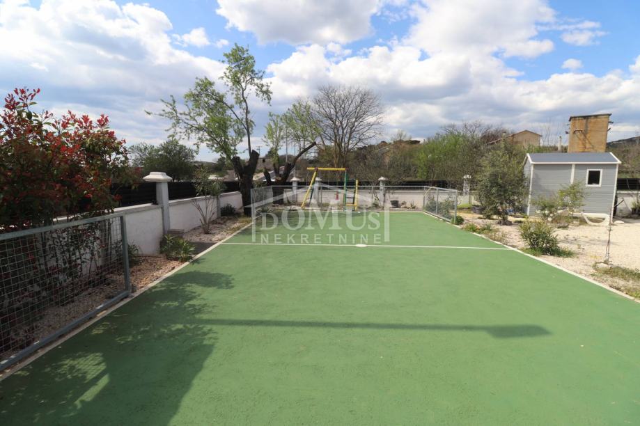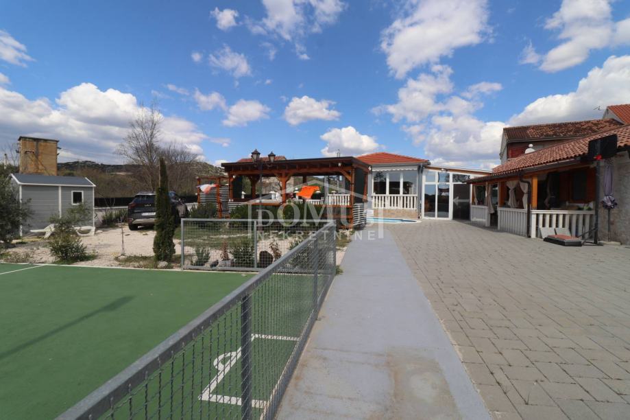 U mirnom okruženju na velikoj parceli površine 982 m2 nalaze se dva objekta kamena prizemnica površine 64 m2 te druga kuća površine 96 m2. Obje kuće su međusobno povezane zimskim vrtom površine 34 m2. Kamena kuća u naravi sastoji se od dnevnog boravka sa kuhinjom sa izlazom na natkrivenu terasu, 2 spavaće sobe i kupaonice. Druga kuća u naravi sastoji se od 2 spavaće sobe, kupaonice, i dnevnog boravka sa kuhinjom te izlaza na terasu / zimski vrt. Kuće su klimatizirane, namještene ali namještaj nije uključen u cijenu. Dvorište je ograđeno, nekretnina je prilagođena osobama sa invaliditetom, ima postavljen video nadzor. Sastavni dio ove prekrasne nekretnine također čine bazen 25 m2, tenisko igralište, sunčalište, parking sa nadstrešnicom za više auta, vrtna kućica. Okućnica je lijepo uređena sa mediteranskim biljem, iza kuće se nalazi vrtna kućica te natkriveni parking. Udaljenost do plaže u Pirovcu je 7 km.
