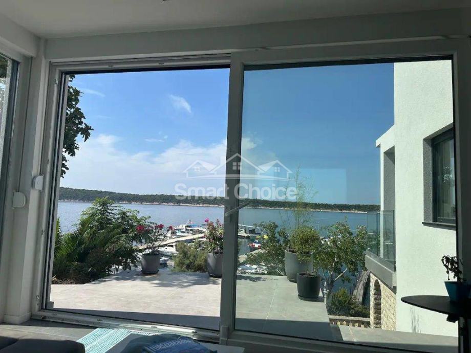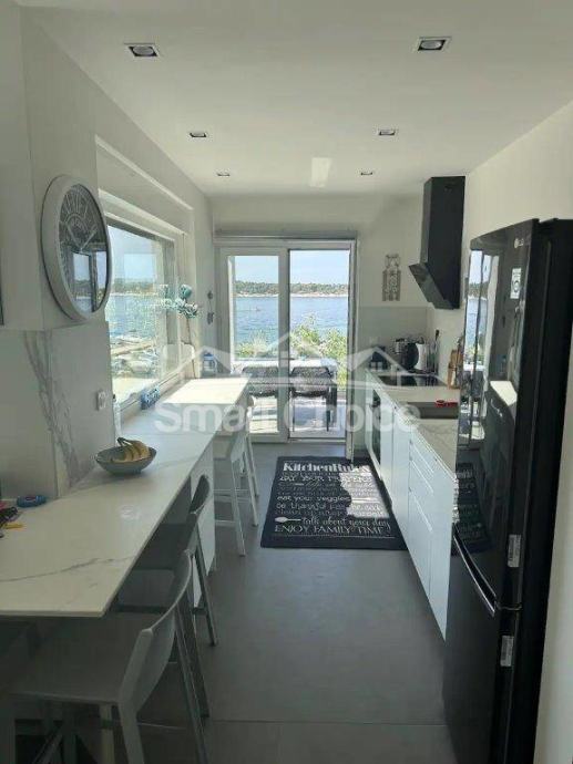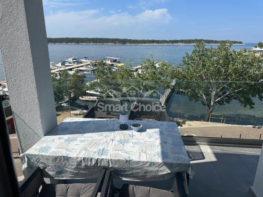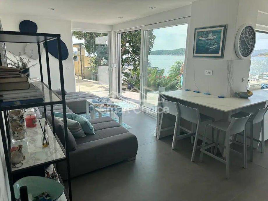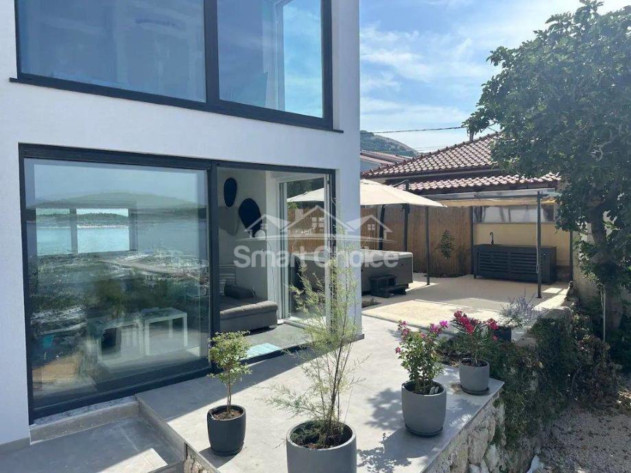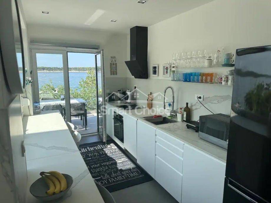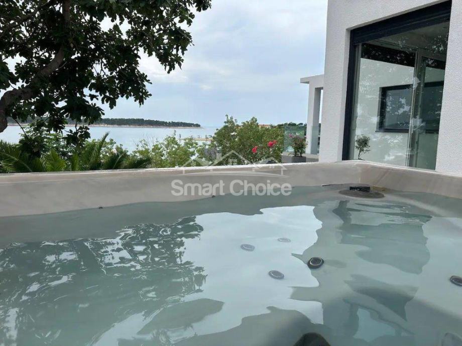 Rab (Banjol) - ekskluzivna etaža prvi red do mora sa velikom terasom i dvorištem na kojem je smješten jacuzzi. Stan se sastoji od dnevnog boravka, kuhinje, tri spavaće sobe (jedna s bračnim krevetom i dva bračna kreveta), dvije kupaonice (jedna privatna) i terasom od 35 m2 okrenuta prema moru. Stanu pripadaju 2 parkirna mjesta.