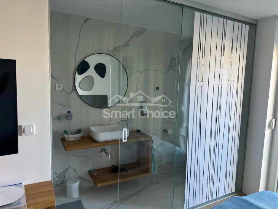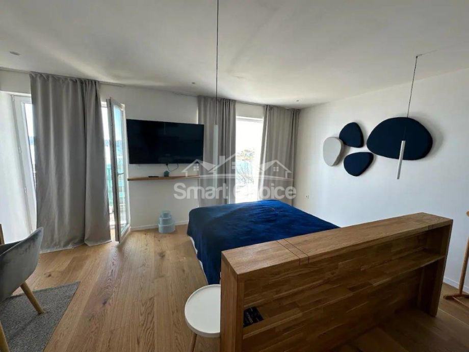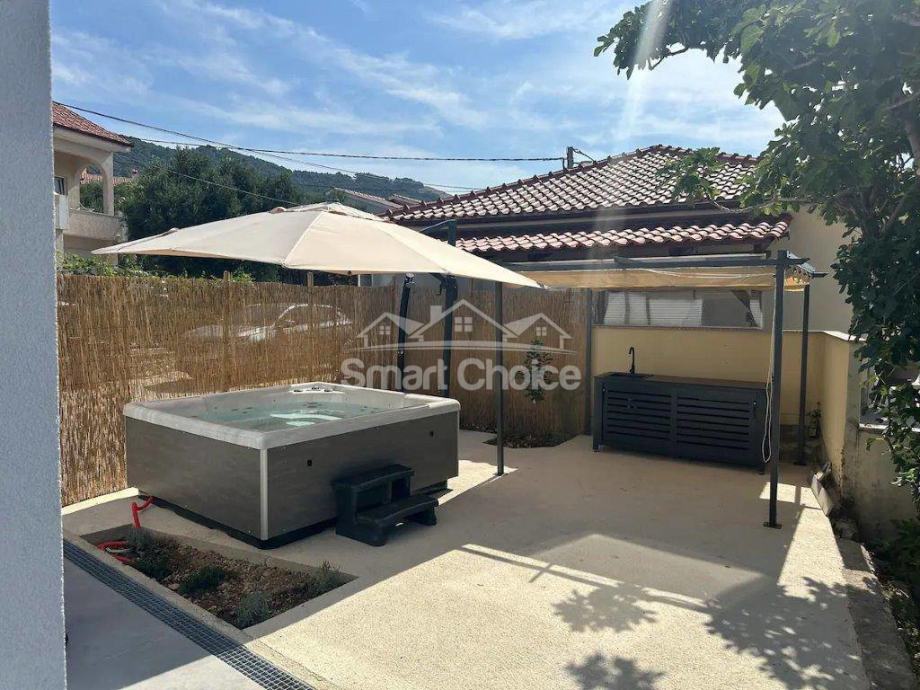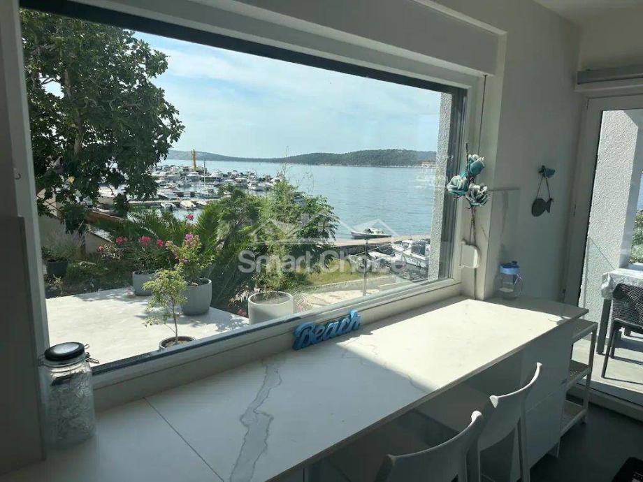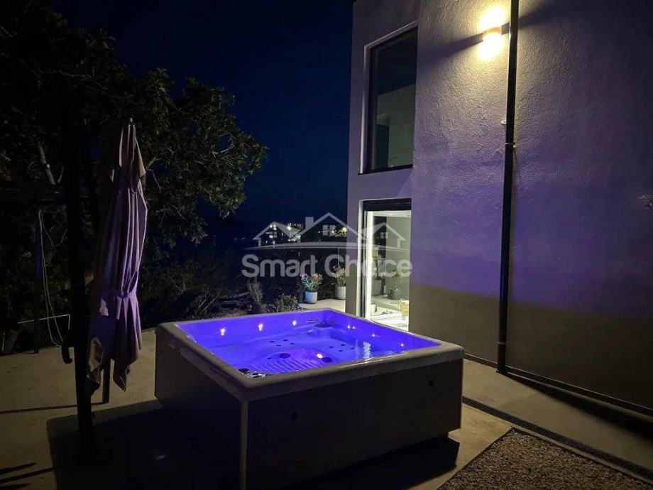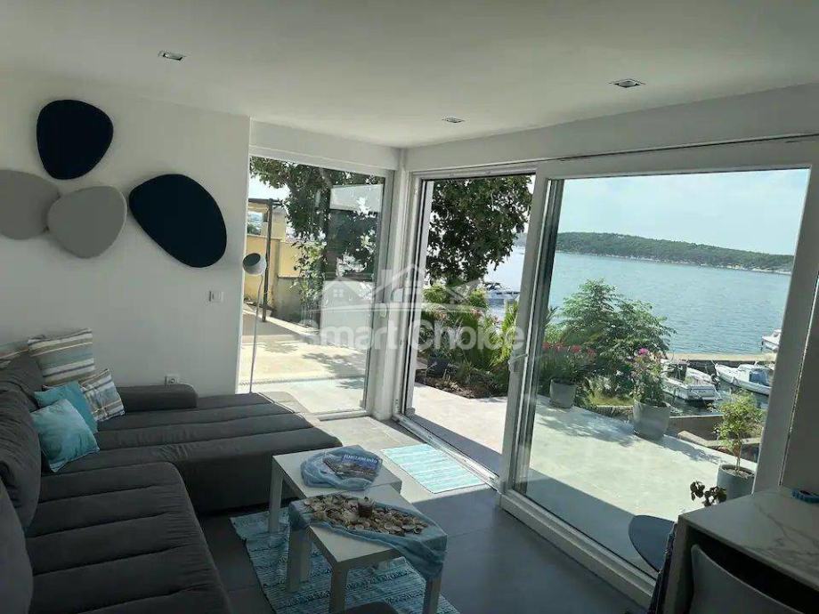 Rab (Banjol) - ekskluzivna etaža prvi red do mora sa velikom terasom i dvorištem na kojem je smješten jacuzzi. Stan se sastoji od dnevnog boravka, kuhinje, tri spavaće sobe (jedna s bračnim krevetom i dva bračna kreveta), dvije kupaonice (jedna privatna) i terasom od 35 m2 okrenuta prema moru. Stanu pripadaju 2 parkirna mjesta.