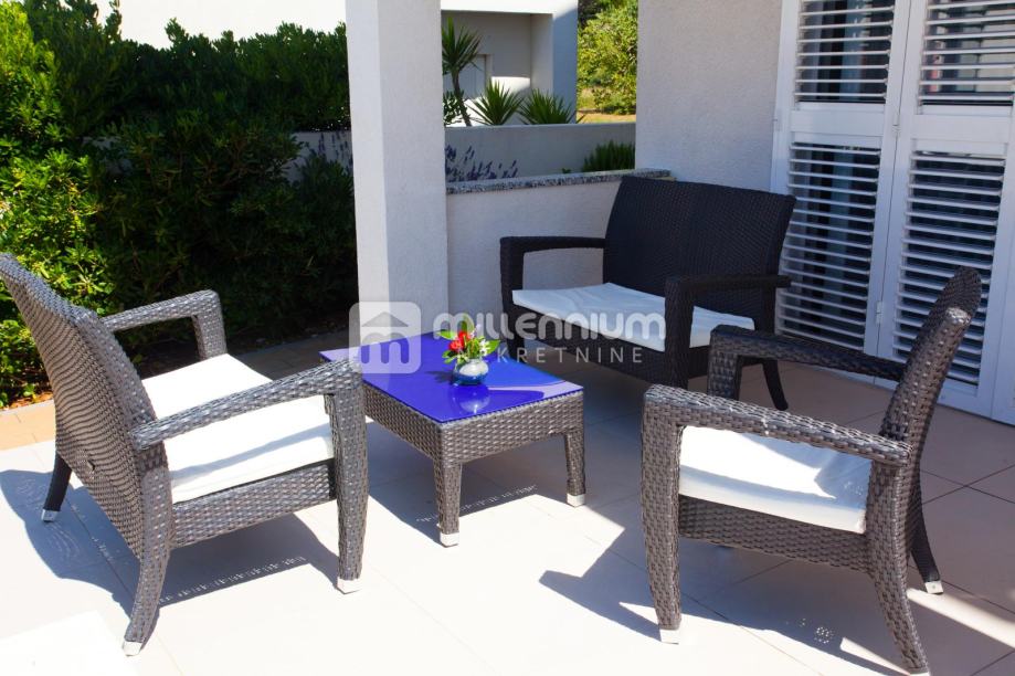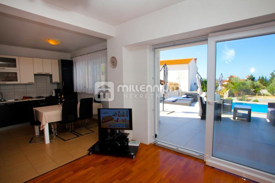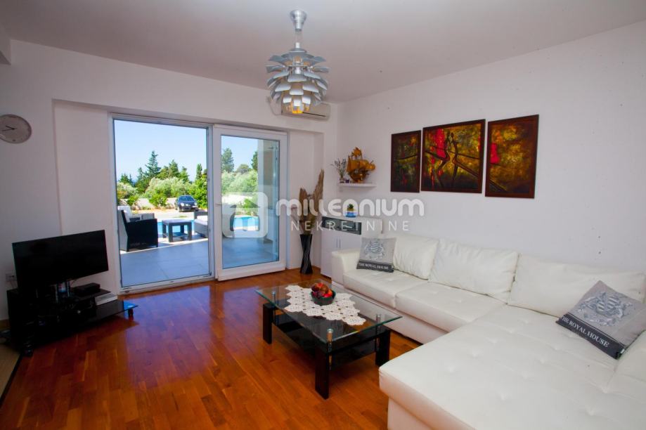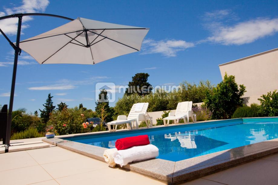 Na uređenoj i održavanoj okućnici se nalazi popločena terasa od 200m2, veliki bazen od 28m2, parkirni prostor, pomoćni objekt i dva roštilja s terasom od 150m2.