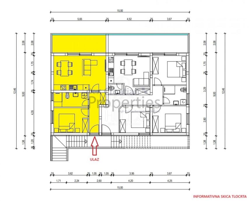 Sami stan se sastoji od ulaznog hodnika, dnevnog boravka, kuhinje, blagovaonice, spavaće sobe, kupaonice i terase.