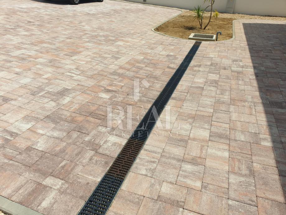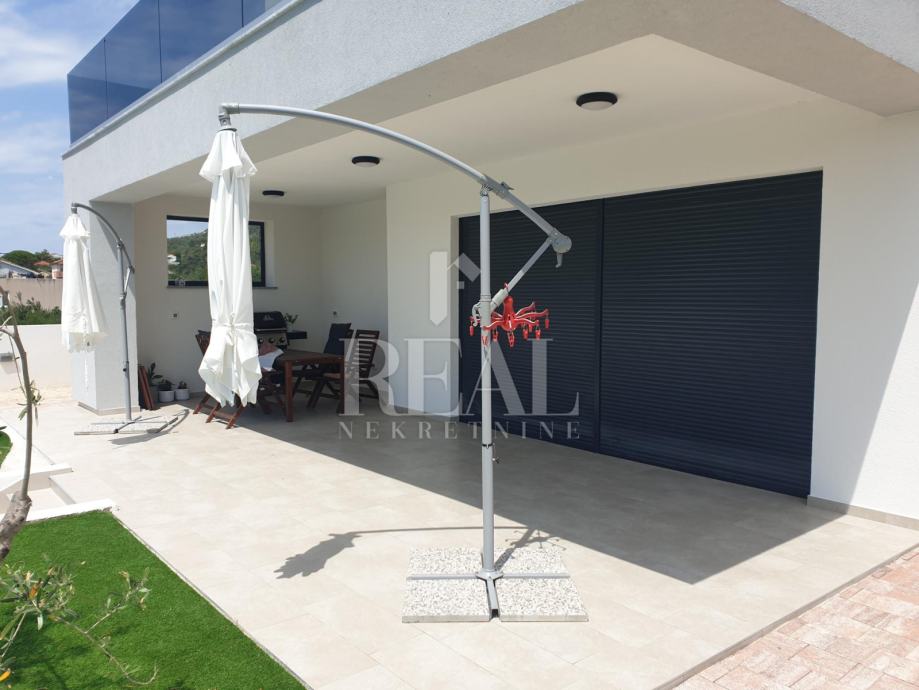 Iz dnevog dijela se izlazi na natkrivenu terasu gdje se nalazi ljetna kuhinja i dalje na okućnicu sa bazenom i sunačalištem.